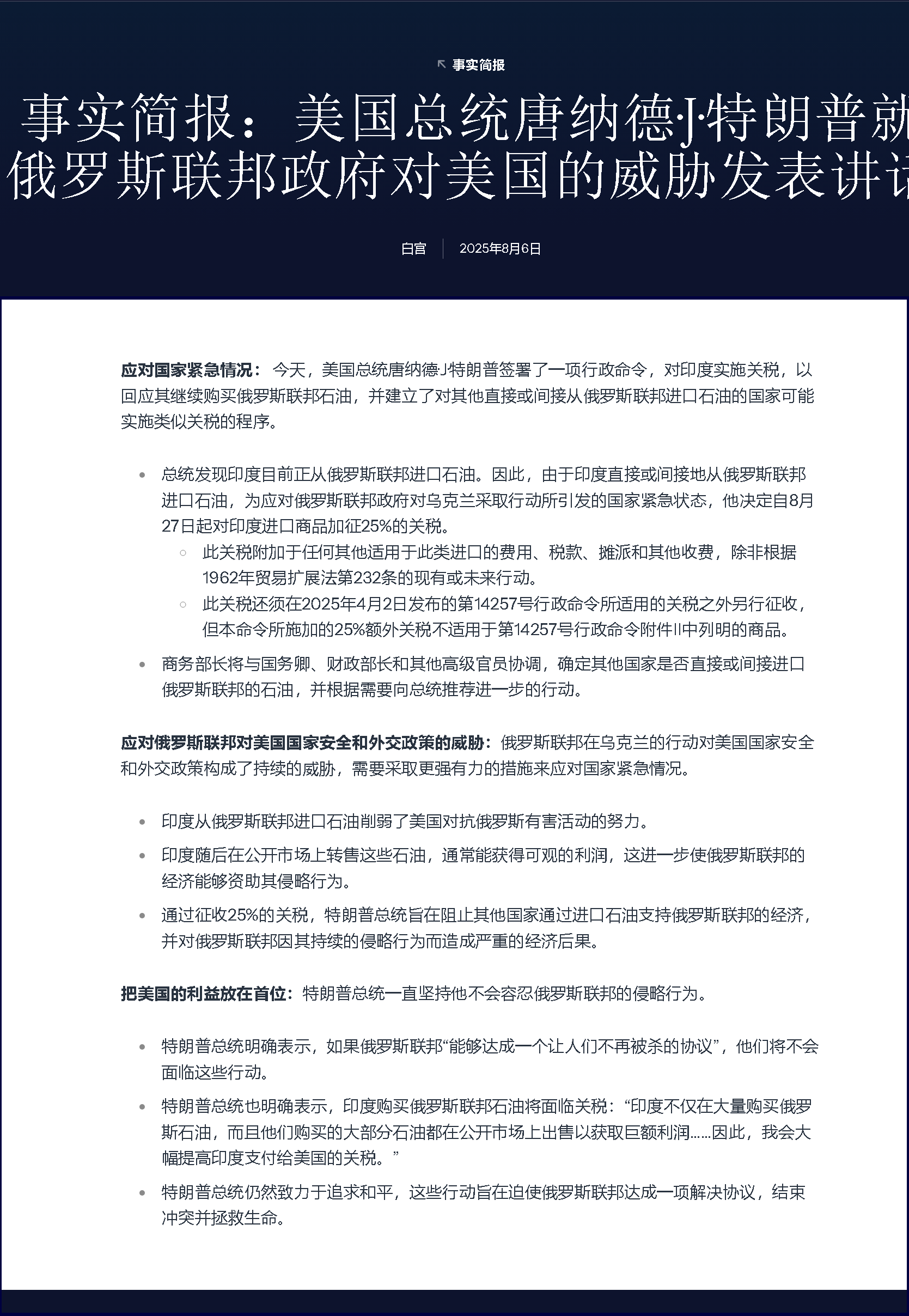 事實簡報:美國總統唐納德·J·特朗普就俄羅斯聯邦政府對美國的威脅發表講話