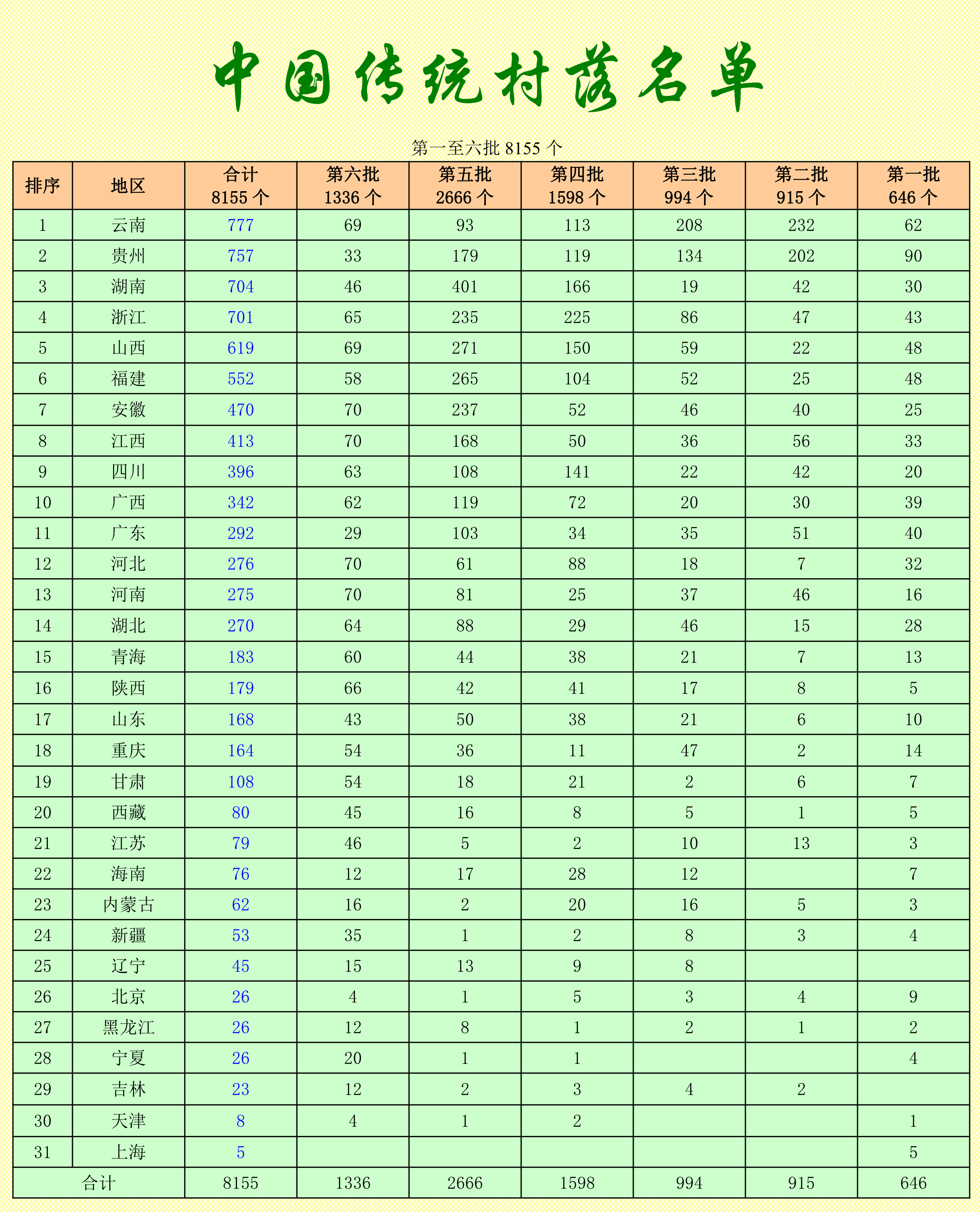 住房和城鄉建設部等六部門近日公布第六批列入中國傳統村落名錄的村落名單。根據《住房和城鄉建設部辦公廳關于實施中國傳統村落掛牌保護工作的通知》要求,各地要按照“一村一檔”建立完善中國傳統村落檔案,并于2023年9月底前完成掛牌工作。