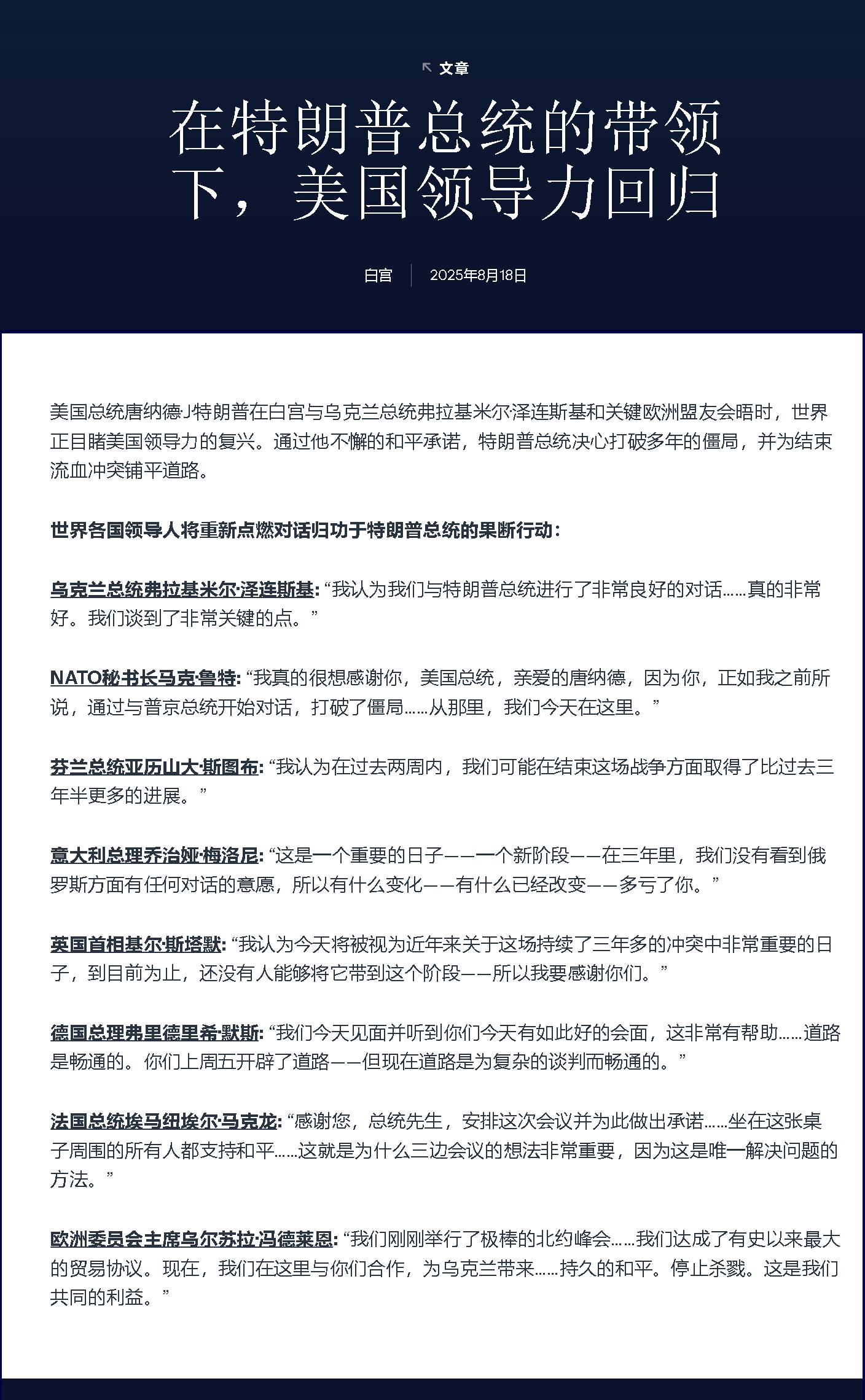 美國總統唐納德·J·特朗普在白宮與烏克蘭總統弗拉基米爾·澤連斯基和關鍵歐洲盟友會晤時,世界正目睹美國領導力的復興。通過他不懈的和平承諾,特朗普總統決心打破多年的僵局,并為結束流血沖突鋪平道路。