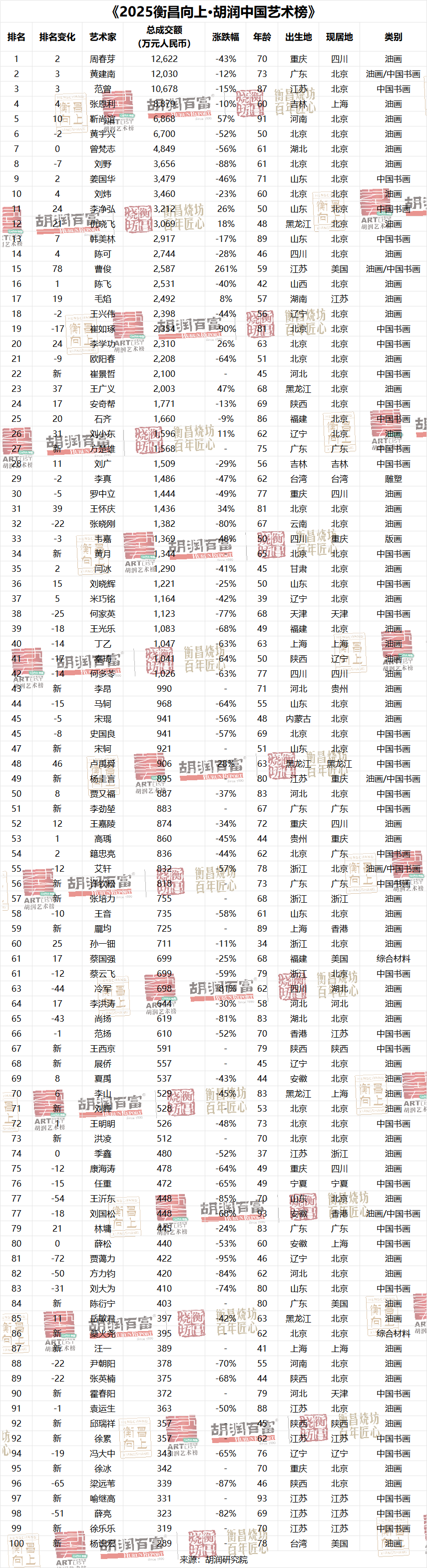 《2025衡昌向上·胡潤中國藝術榜》根據2024年度公開拍賣市場作品總成交額為在世的中國藝術家排名。上拍藝術品均為通過公開場地拍賣,而不包括通過非公開場地出售(畫廊、藝術家本人及私人交易),且包含拍賣公司的中介費用。