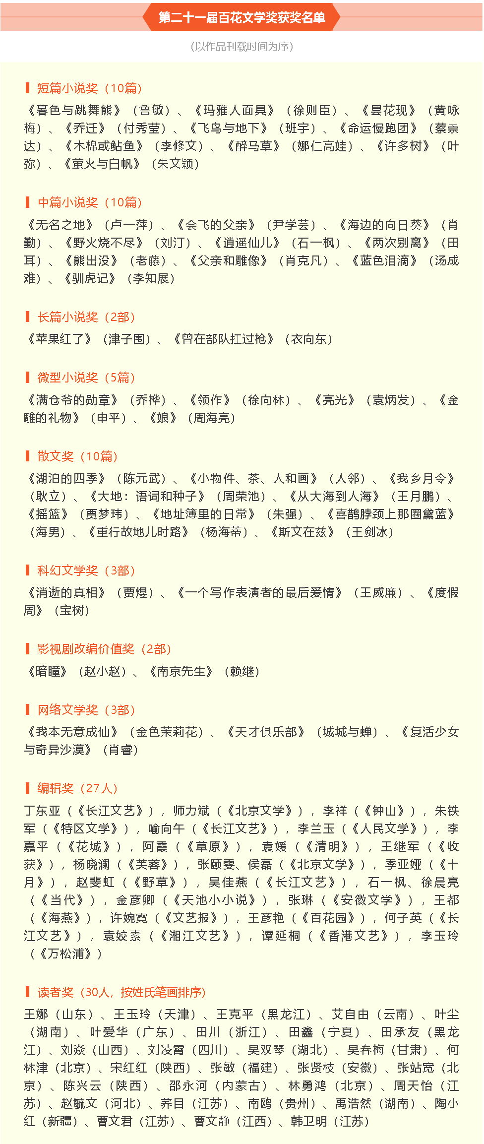 經(jīng)過讀者線上線下投票和專家評審,共評選出短篇小說獎10篇,中篇小說獎10篇,長篇小說獎2篇,微型小說獎5篇,影視劇改編價值獎2篇,散文獎10篇,科幻文學(xué)獎3篇,網(wǎng)絡(luò)文學(xué)獎3篇。
