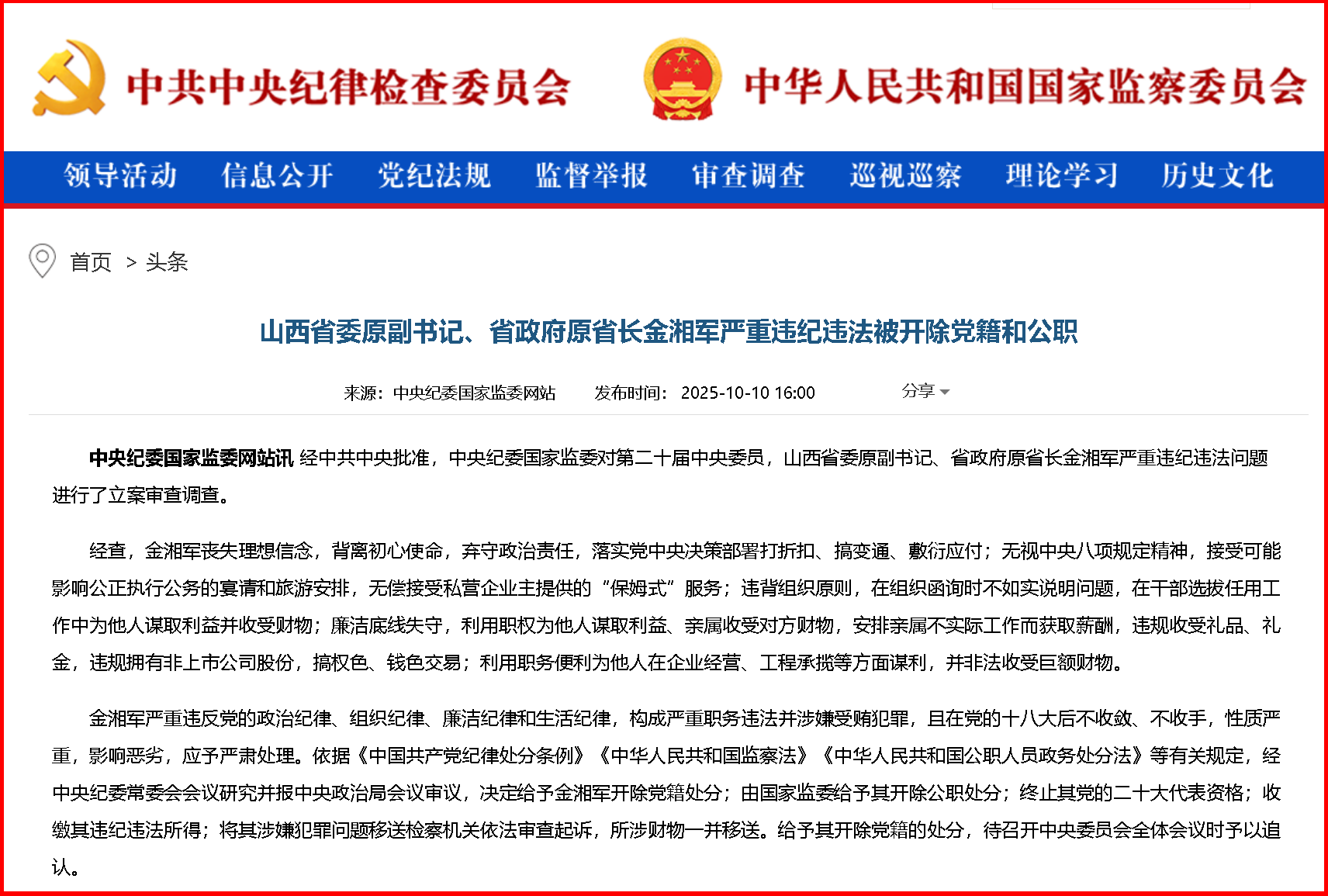 新華社北京10月10日電 經中共中央批準,中央紀委國家監委對第二十屆中央委員,山西省委原副書記、省政府原省長金湘軍嚴重違紀違法問題進行了立案審查調查。