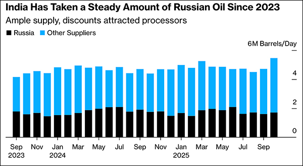 2023年9月以來,印度進口俄油量一直保持穩定。 彭博社制圖