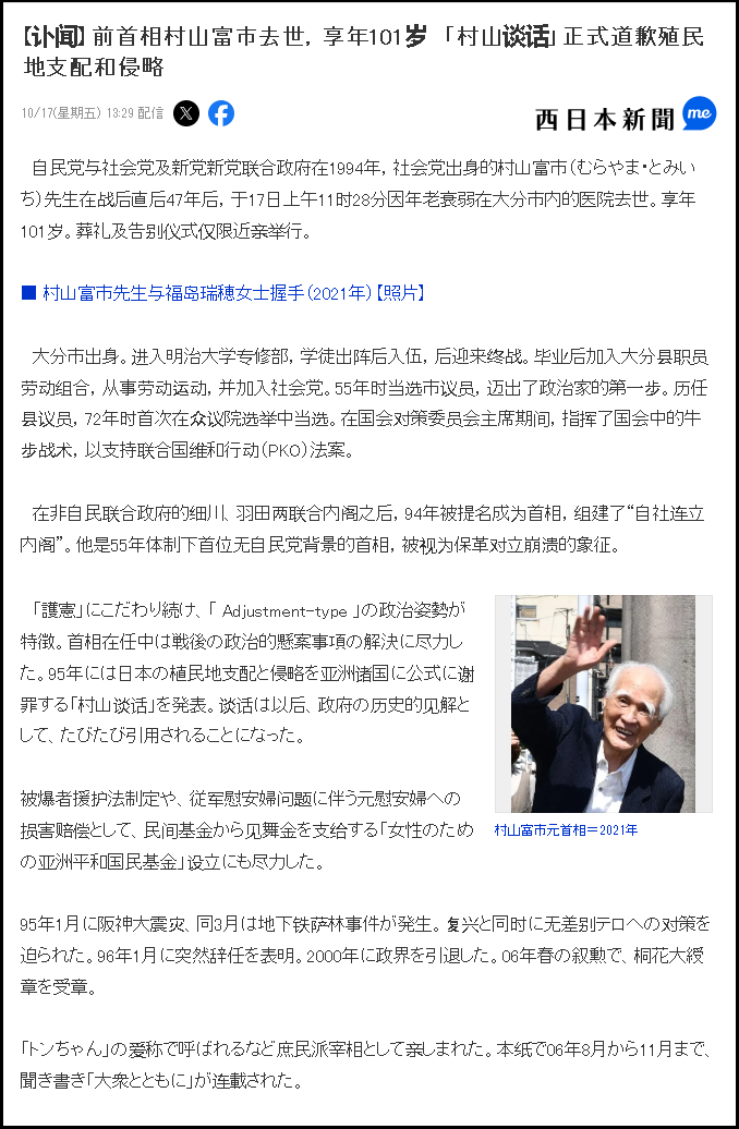 新華社北京10月17日電(記者溫馨、袁睿)日本前首相村山富市17日去世,享年101歲。外交部發言人林劍在當日例行記者會上表示,中方對村山富市前首相逝世表示沉痛哀悼,向家屬致以誠摯慰問。村山富市先生為促進中日友好事業所作出的貢獻將被永遠銘記。