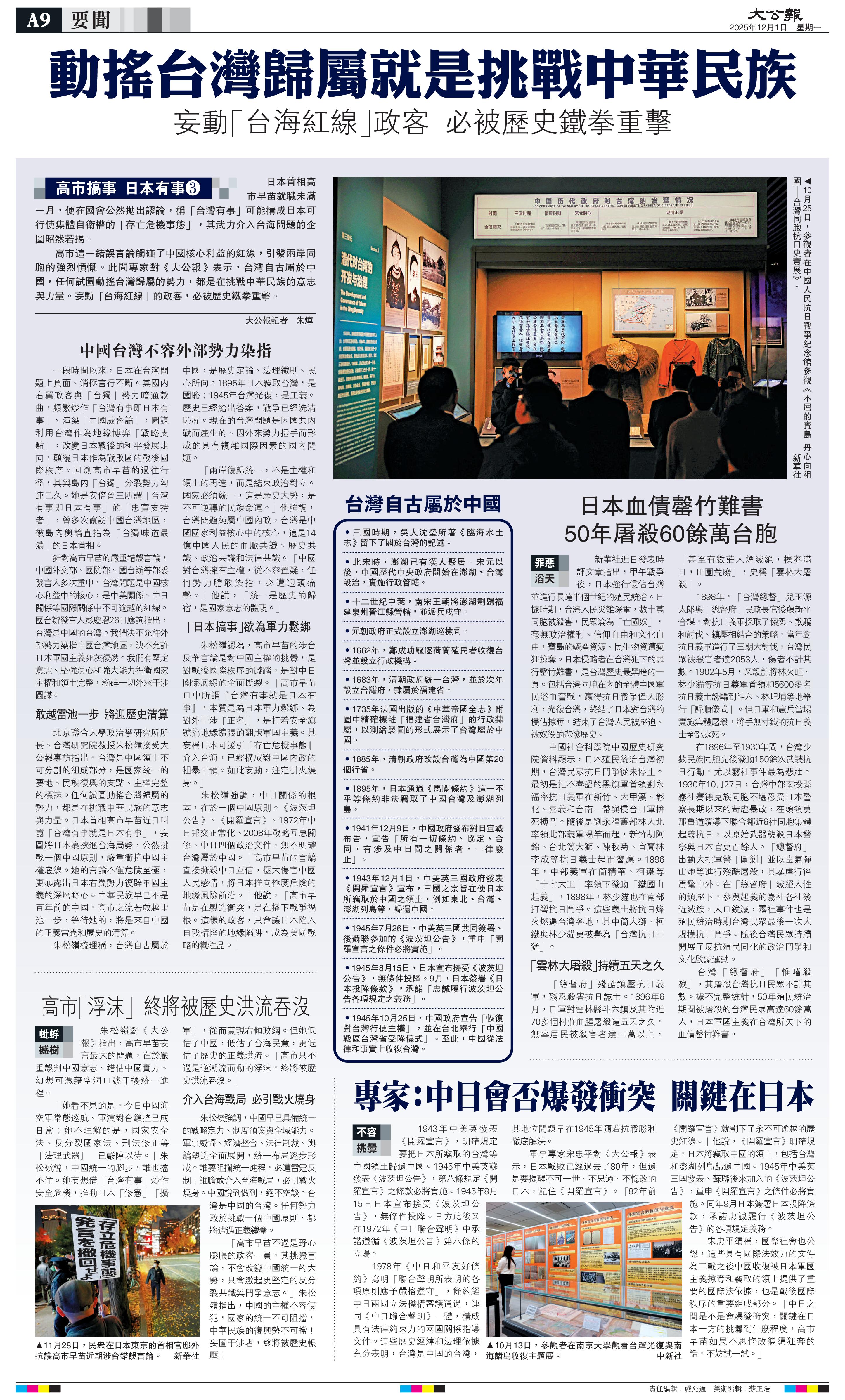日方避而不談的,恐怕不僅僅是在臺灣問題上的立場。今天是《開羅宣言》發表82周年。《開羅宣言》等一系列國際法律文件不僅明確了中國對臺灣的主權,更是世界反法西斯戰爭的重大成果,構成戰后國際秩序的重要組成部分。遵守其有關規定是日方必須承擔的國際法義務,也是戰后日本重獲國際社會接納的前提。現在日方只字不提具有充分國際法效力的上述文件,卻一味引用一個把受日本殖民侵略最嚴重的亞洲鄰國特別是中國排斥在外的文件,這是對日本軍國主義侵略慘痛記憶的漠視,對世界反法西斯戰爭歷史真相的褻瀆,對聯合國權威和戰后國際秩序的公然挑戰。日方近年來大幅調整安保政策,逐年增加防衛預算,圖謀修改“無核三原則”。日本某些勢力正極力突破“和平憲法”束縛,企圖違背國際法規定的戰敗國義務。這些人從未真正汲取歷史教訓,從未真正直面和反思日本在戰爭中犯下的滔天罪責,從未真正遏止軍國主義在日本死灰復燃,反而企圖用美化侵略的敘事和“避而不談”的手法,讓世人遺忘,為自己“松綁”。這種伎倆欺騙不了世人。