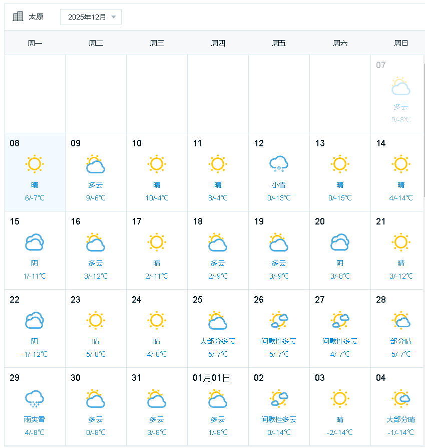 根據太原市氣象臺預報,本周我市以晴天間多云天氣為主。受冷空氣影響,12月11日至13日有大風、降溫天氣。其中,12日有小到中雪,部分地區大雪,伴有4~6級、短時7級或以上西北風,氣溫明顯下降。