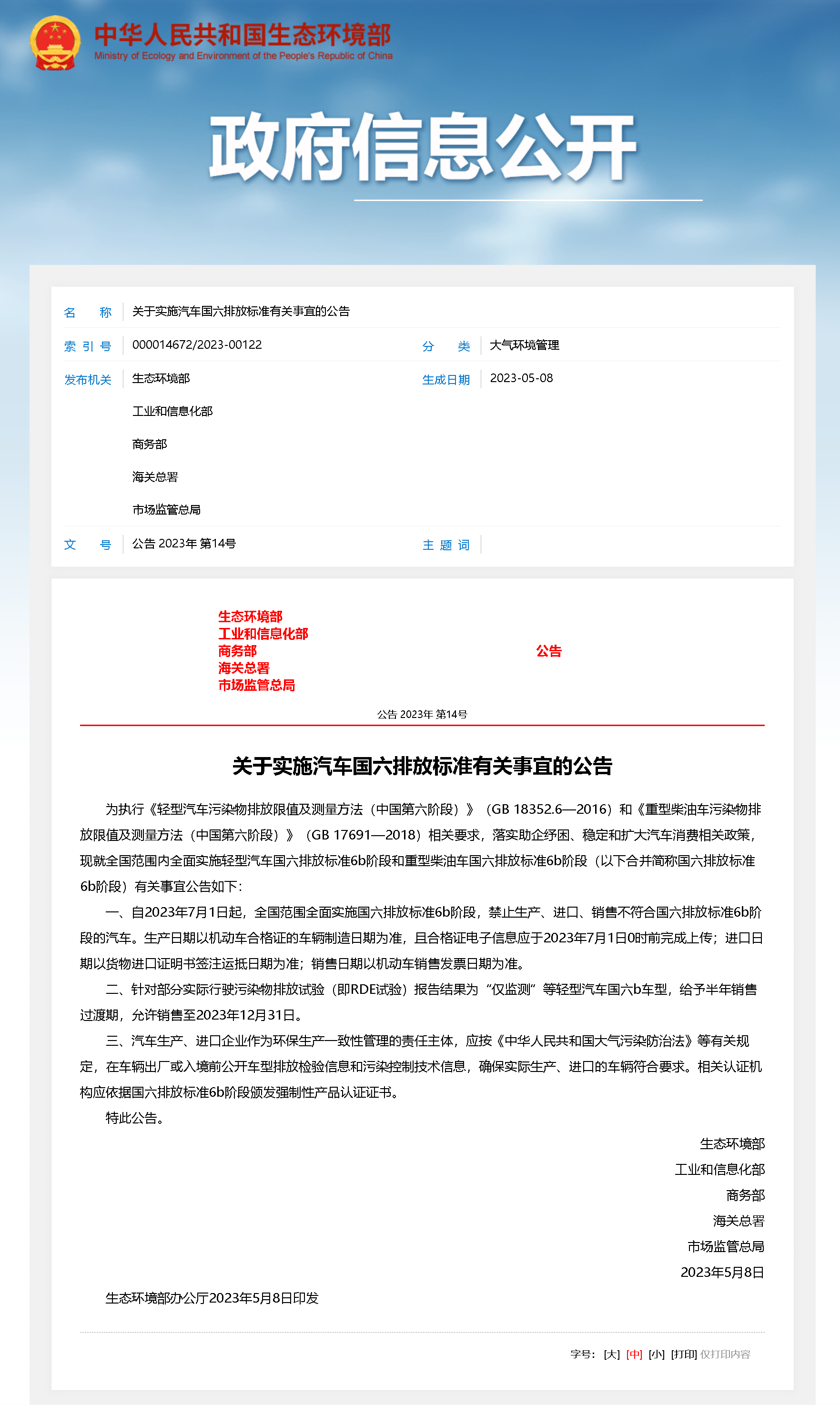 根據生態環境部、工信部、商務部、海關總署、市場監管總局日前聯合發布的公告,本次汽車排放標準提升包括輕型汽車和重型柴油車。生產日期以機動車合格證的車輛制造日期為準,且合格證電子信息應于2023年7月1日0時前完成上傳;進口日期以貨物進口證明書簽注運抵日期為準;銷售日期以機動車銷售發票日期為準。