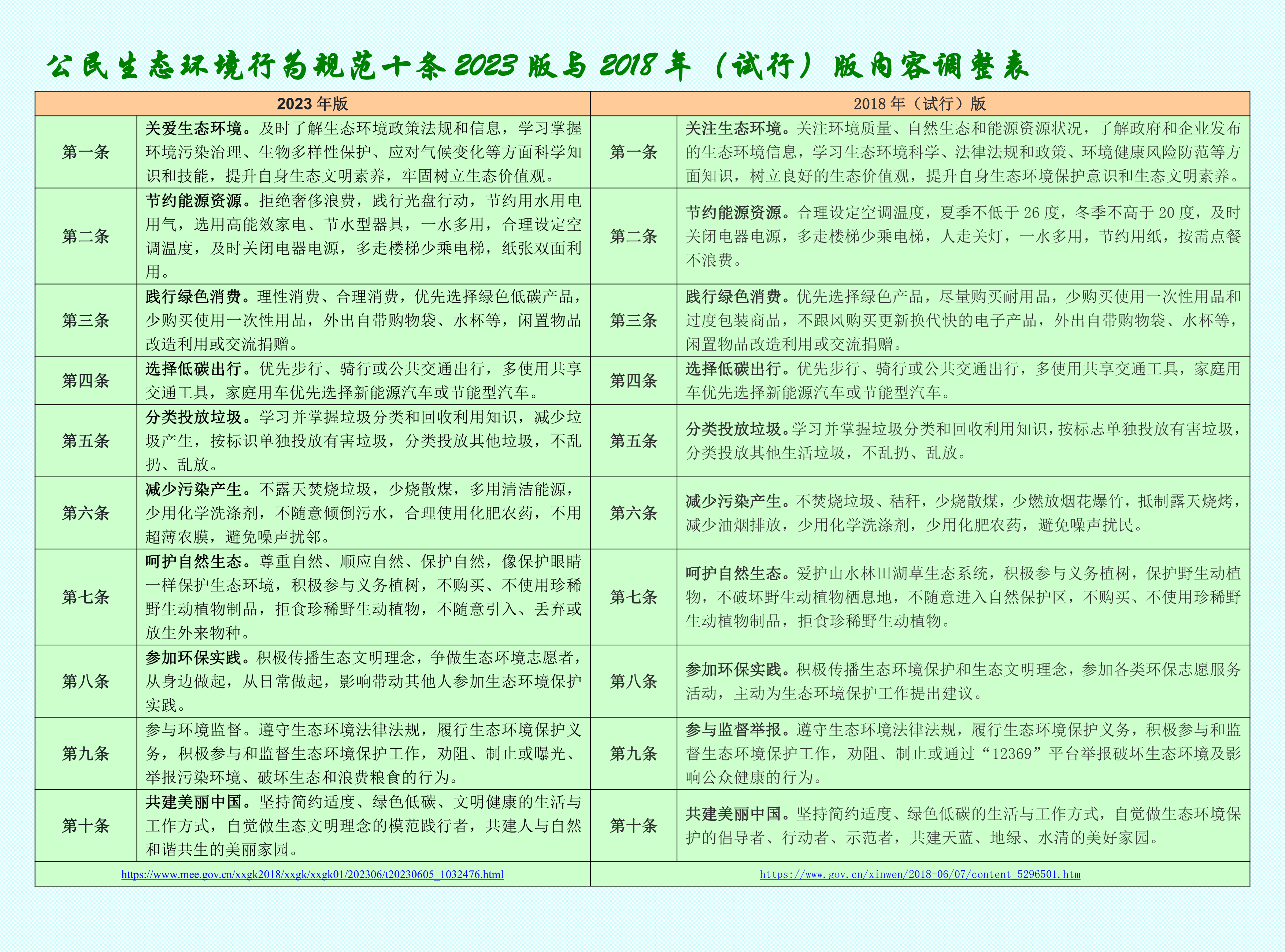 新修訂的《公民生態環境行為規范十條》包括關愛生態環境、節約能源資源、踐行綠色消費、選擇低碳出行、分類投放垃圾、減少污染產生、呵護自然生態、參加環保實踐、參與環境監督、共建美麗中國等十條內容。