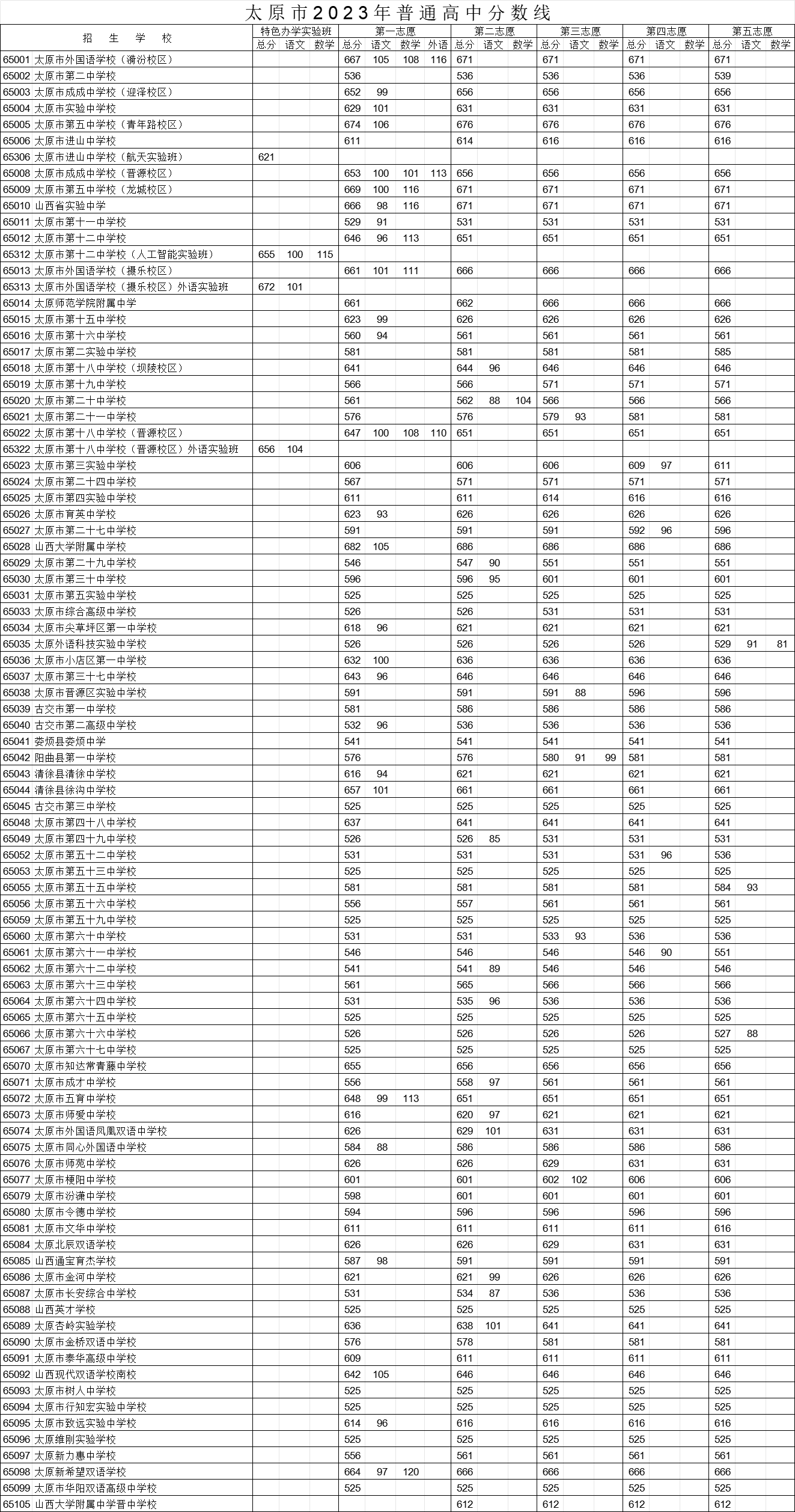 太原市進(jìn)山中學(xué)校航天實(shí)驗(yàn)班、太原市第十二中學(xué)校人工智能實(shí)驗(yàn)班、太原市外國(guó)語(yǔ)學(xué)校(攝樂(lè)校區(qū))外語(yǔ)實(shí)驗(yàn)班、太原市第十八中學(xué)校(晉源校區(qū))外語(yǔ)實(shí)驗(yàn)班,分?jǐn)?shù)線控制在中考總分85%(2023年為621分)的基礎(chǔ)上,按計(jì)劃、按分?jǐn)?shù)、按志愿擇優(yōu)錄取;進(jìn)山中學(xué)初中航天實(shí)驗(yàn)班在籍考生填報(bào)本校航天實(shí)驗(yàn)班志愿,在全市普通高中最低錄取控制線上按招生計(jì)劃優(yōu)先擇優(yōu)錄取。