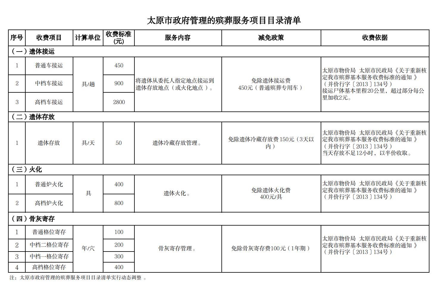 《太原市政府管理的殯葬服務項目目錄清單》11月15日公布,涉及4項收費項目。