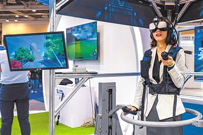 第二十一屆中國(蘇州)電子信息博覽會日前在蘇州工業園區舉辦。圖為觀眾在博覽會上體驗5G+元宇宙游戲。張 鋒攝(人民視覺)