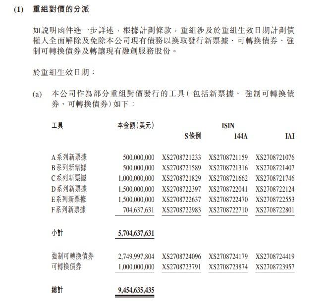 根據公告,本次融創中國的境外債重組規模約百億美元,債權人現有債務將被置換為新票據、強制可轉換債券、可轉換債券、融創服務的股票,分別對價57億美元、27.5億美元、10億美元、7.75億美元。