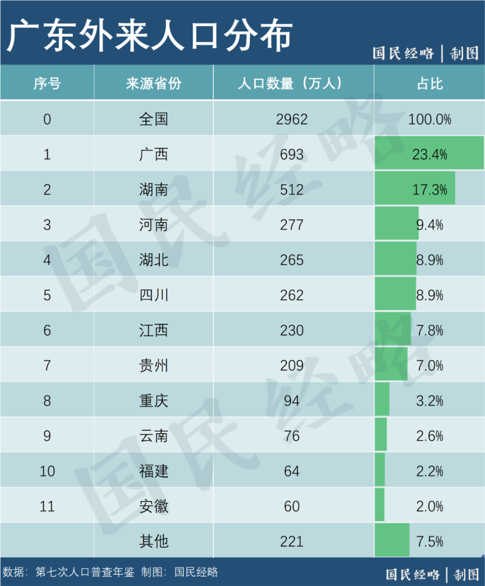 七普數(shù)據(jù)顯示,廣東外來人口總規(guī)模高達(dá)2962萬人,占總?cè)丝诘?/4左右。