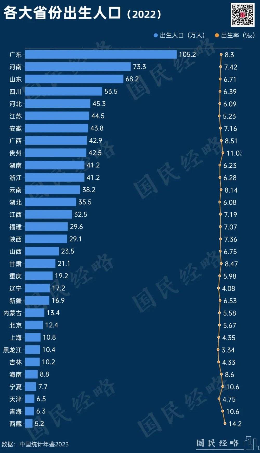 與之對(duì)比,同為全國(guó)TOP5人口大省的山東、河南、江蘇、四川,2022年出生人口分別為68.2萬、73.3萬、44.5萬、53.5萬。