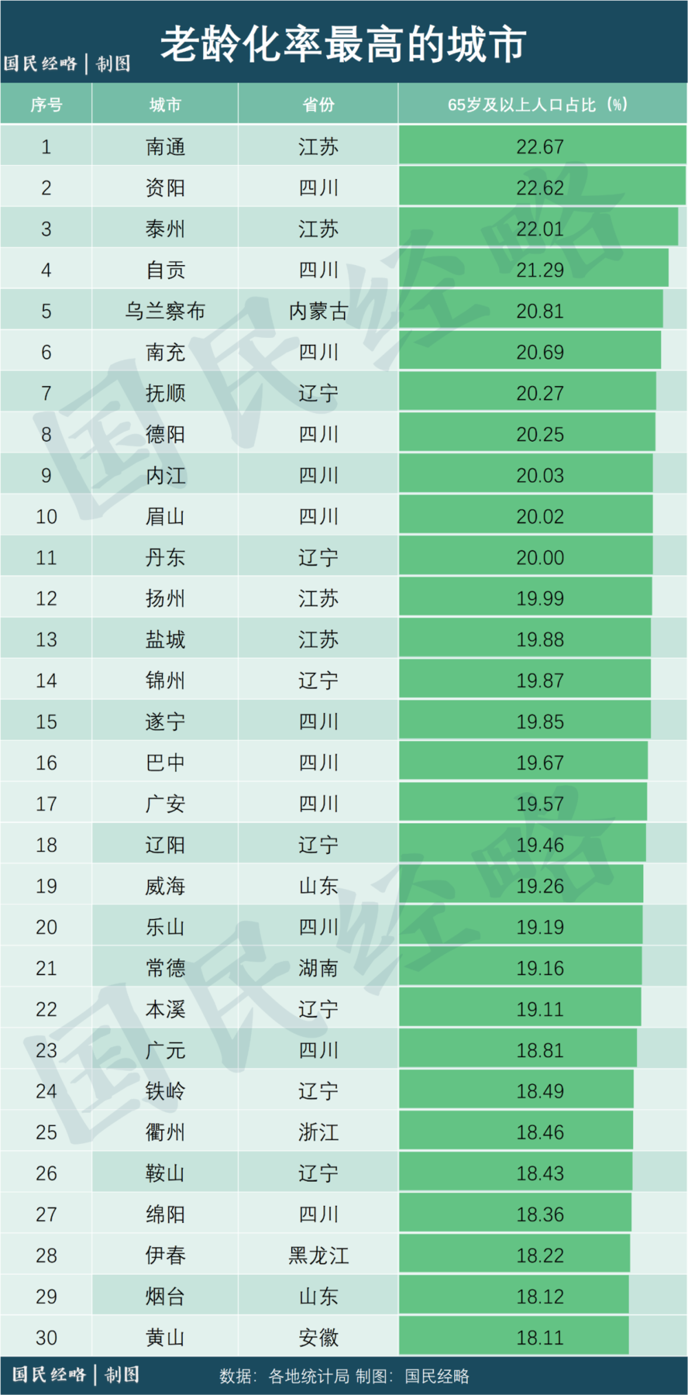 根據(jù)七普,2020年,江蘇南通老齡化率高達(dá)22.67%,超過東北所有地市,位居全國(guó)第一。