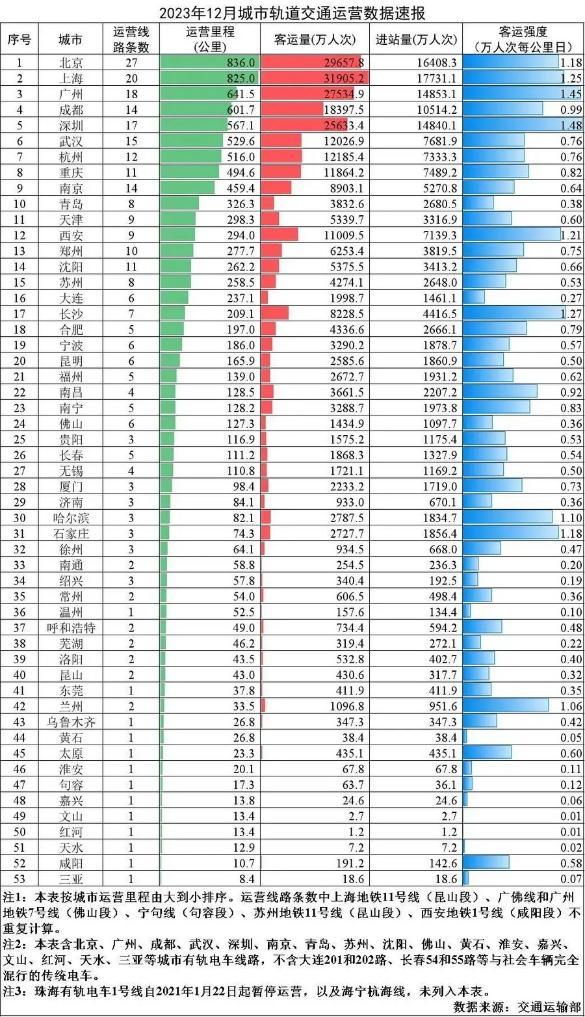 據交通運輸部有關負責人介紹,2023年12月,我國城市軌道交通新增運營里程250.1公里,新增運營線路6條,為武漢地鐵19號線、重慶地鐵18號線、天津地鐵11號線、鄭州地鐵12號線、貴陽地鐵3號線、南通地鐵2號線;新增運營區段11個,為北京地鐵11號線西段剩余段、北京地鐵16號線剩余段、北京地鐵17號線北段、廣州地鐵5號線東延段、廣州地鐵7號線二期、深圳地鐵8號線二期、武漢地鐵5號線調整工程、南京地鐵7號線南段、合肥地鐵2號線延長線、合肥地鐵3號線延長線、哈爾濱地鐵3號線二期西北半環(中華巴洛克街區站至北馬路站)。