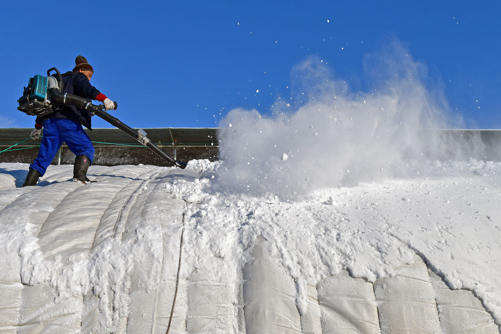 2023年12月17日,農民在山東省煙臺市福山區門樓街道用鼓風機清理暖棚上的積雪。新華社發(孫文潭攝)