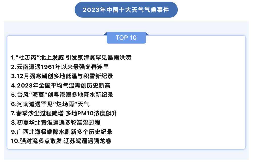 近年來,“XX年一遇”的高溫、暴雨、寒潮似乎頻繁了不少,“極端天氣”這個曾經略顯生僻的氣象專業名詞也逐漸被公眾熟知。國家氣候中心1月19日發布2023年國內十大天氣氣候事件,臺風“杜蘇芮”北上引發京津冀罕見暴雨洪澇、春季沙塵過程陡增、遼蘇皖遭遇強龍卷等讓大家印象深刻的極端天氣均在列。
