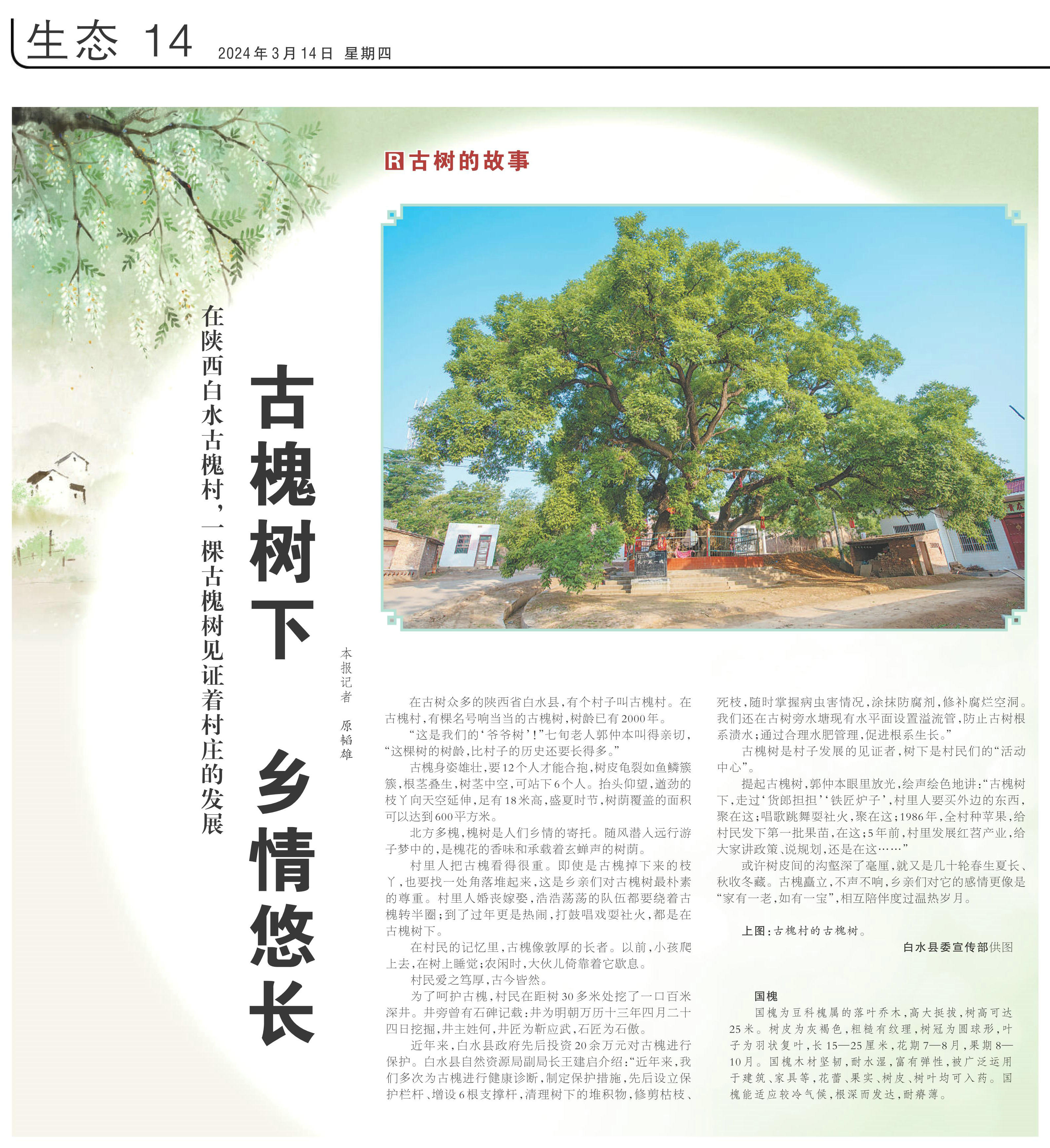 在古樹眾多的陜西省白水縣,有個(gè)村子叫古槐村。在古槐村,有棵名號(hào)響當(dāng)當(dāng)?shù)墓呕睒洌瑯潺g已有2000年。