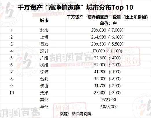 廣東地區今年成為最多千萬資產“高凈值家庭”的地區,比上年減少8,000戶至30萬戶,減少2.2%,其中擁有千萬可投資資產的“高凈值家庭”數量有16.9萬戶;北京第二,比上年減少7,000戶,達到29.9萬戶,減少2.3%,其中擁有千萬可投資資產的“高凈值家庭”數量有15.2萬戶;上海第三,千萬資產“高凈值家庭”比上年減少6,100戶至26.5萬戶,減少2.3%,其中擁有千萬可投資資產的“高凈值家庭”數量有14.7萬戶;浙江第四,千萬資產“高凈值家庭”比上年減少1,200戶,達到21.5萬戶,減少0.6%,其中擁有千萬可投資資產的“高凈值家庭”數量有10.7萬戶;香港第五,千萬資產“高凈值家庭”比上年減少5,500戶,達到21萬戶,減少2.6%,其中擁有千萬可投資資產的“高凈值家庭”數量有10.7萬戶。