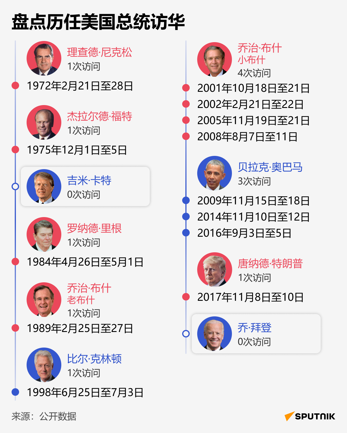 細心的俄羅斯衛星通訊社盤點歷任美國總統訪華記錄,五十二年間10位中8位13次訪問中國。