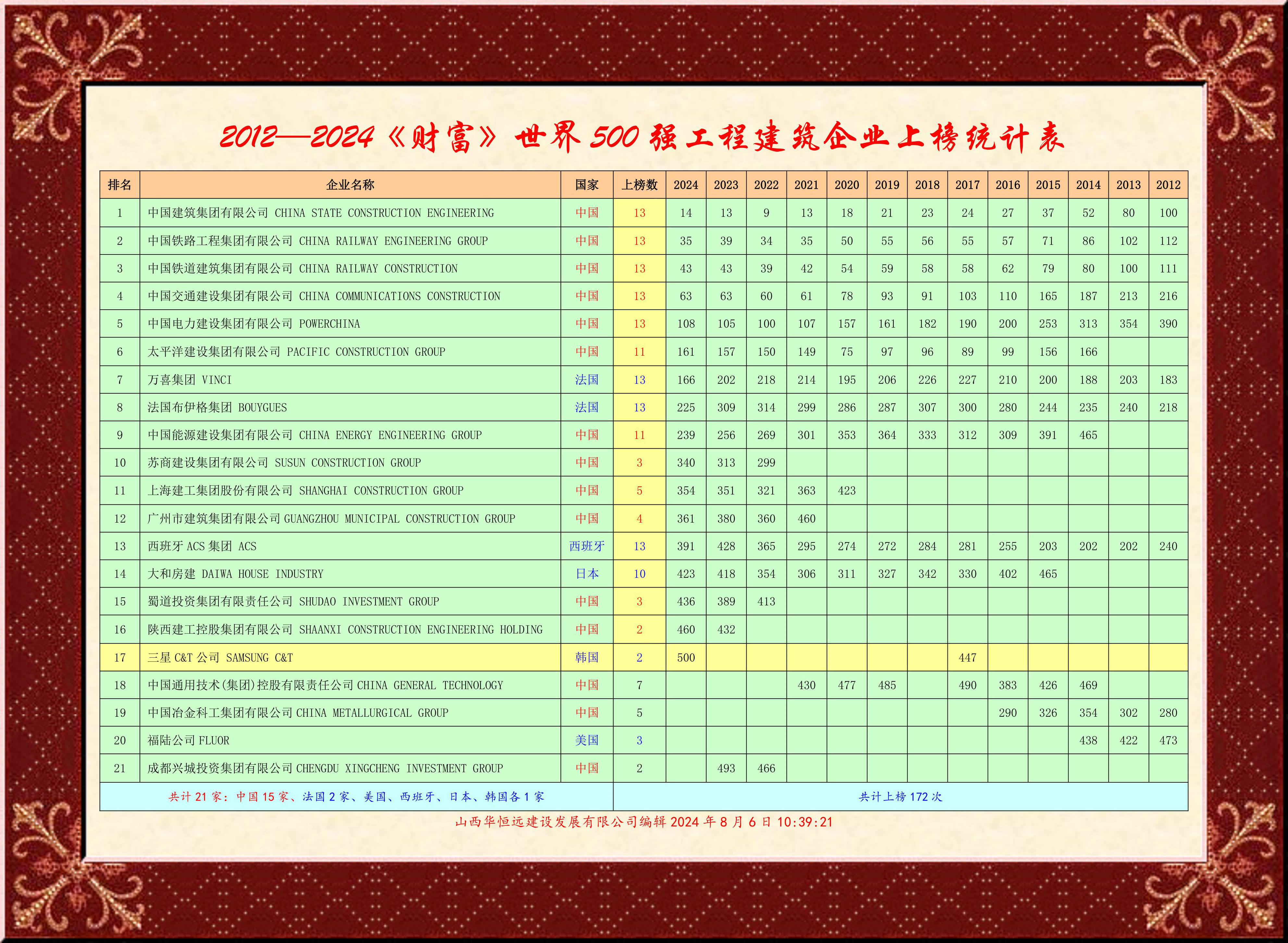 1 中國建筑集團有限公司 CHINA STATE CONSTRUCTION ENGINEERING 320,430.5 14 2024 1.