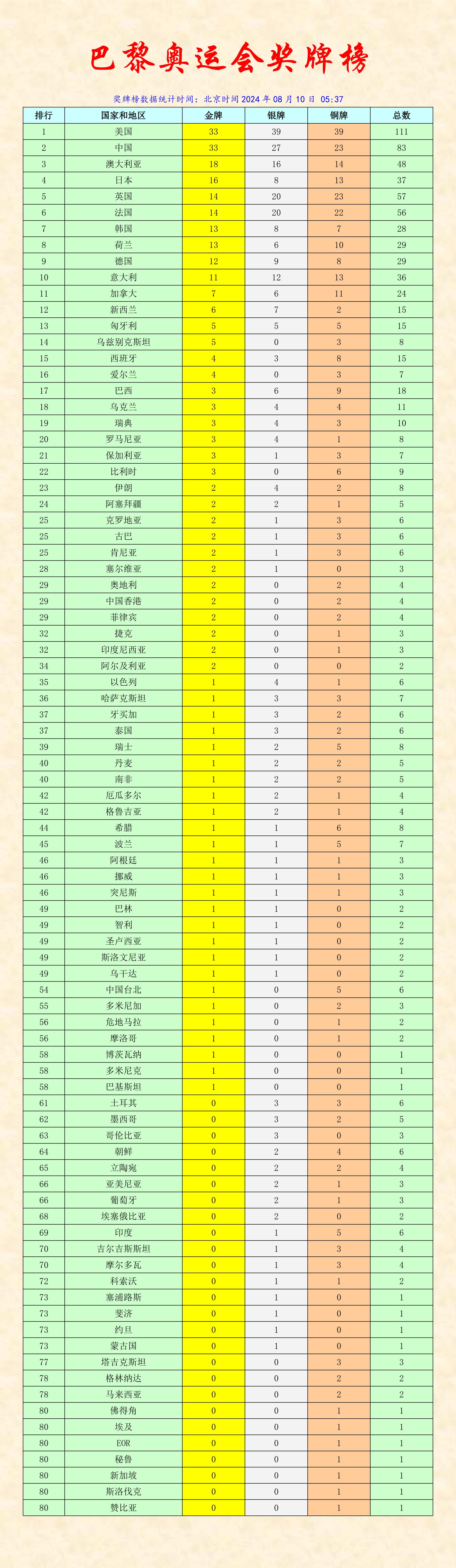 【學習園地】感悟巴黎奧運會獎牌榜——看看最后三日總成績