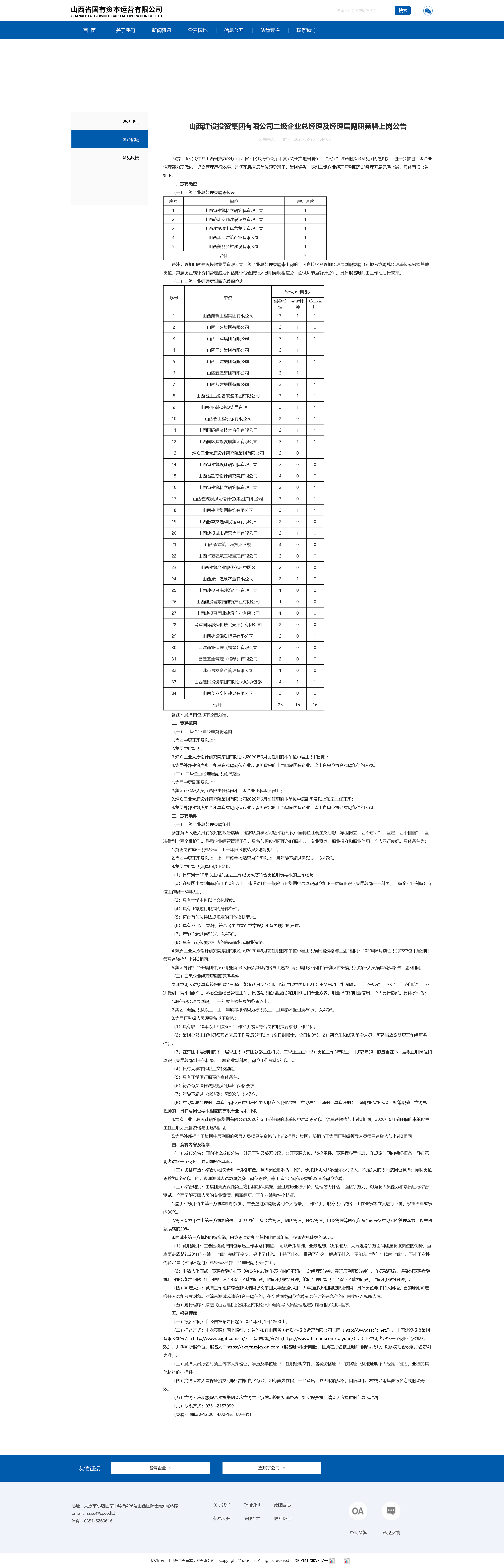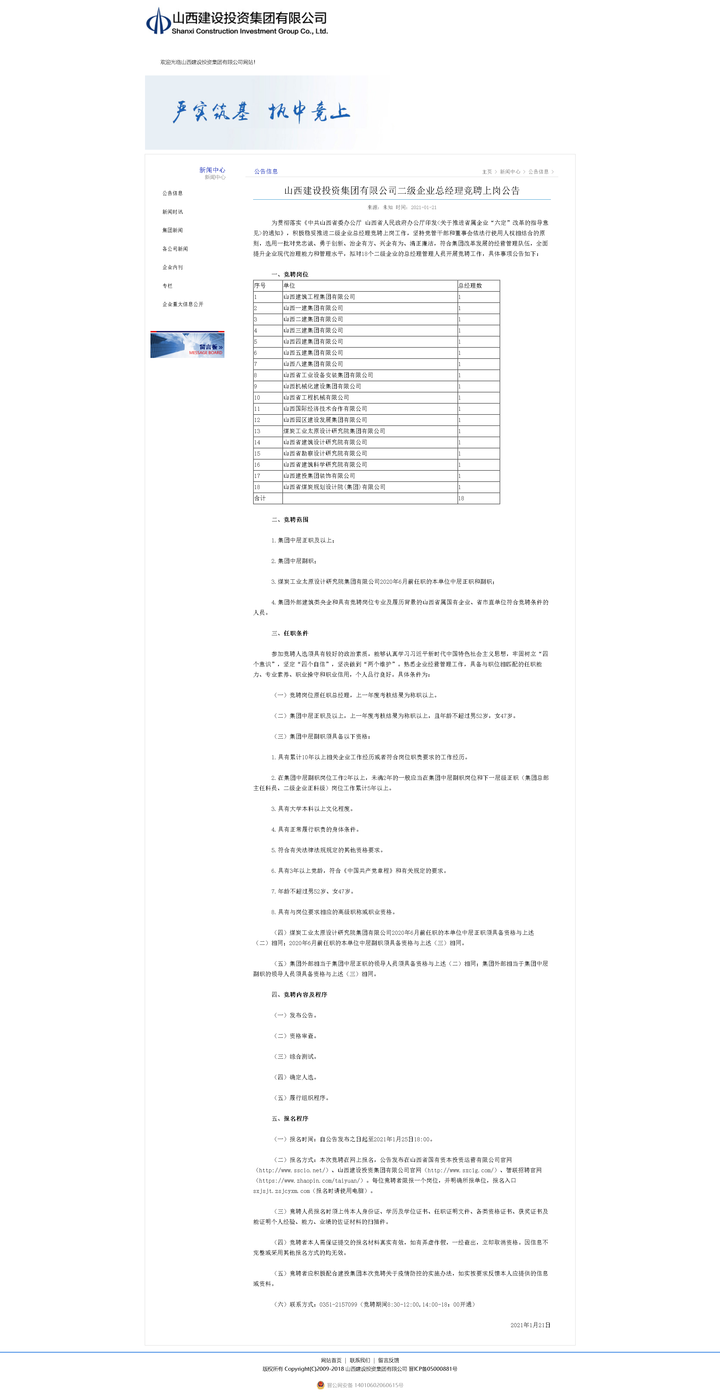2021年1月22日,山西省人民政府網(wǎng)站、山西省國有資本運(yùn)營有限公司網(wǎng)站、山西建設(shè)投資集團(tuán)有限公司網(wǎng)站,同時(shí)發(fā)布了《山西建設(shè)投資集團(tuán)有限公司二級(jí)企業(yè)總經(jīng)理競(jìng)聘上崗公告》的公告。