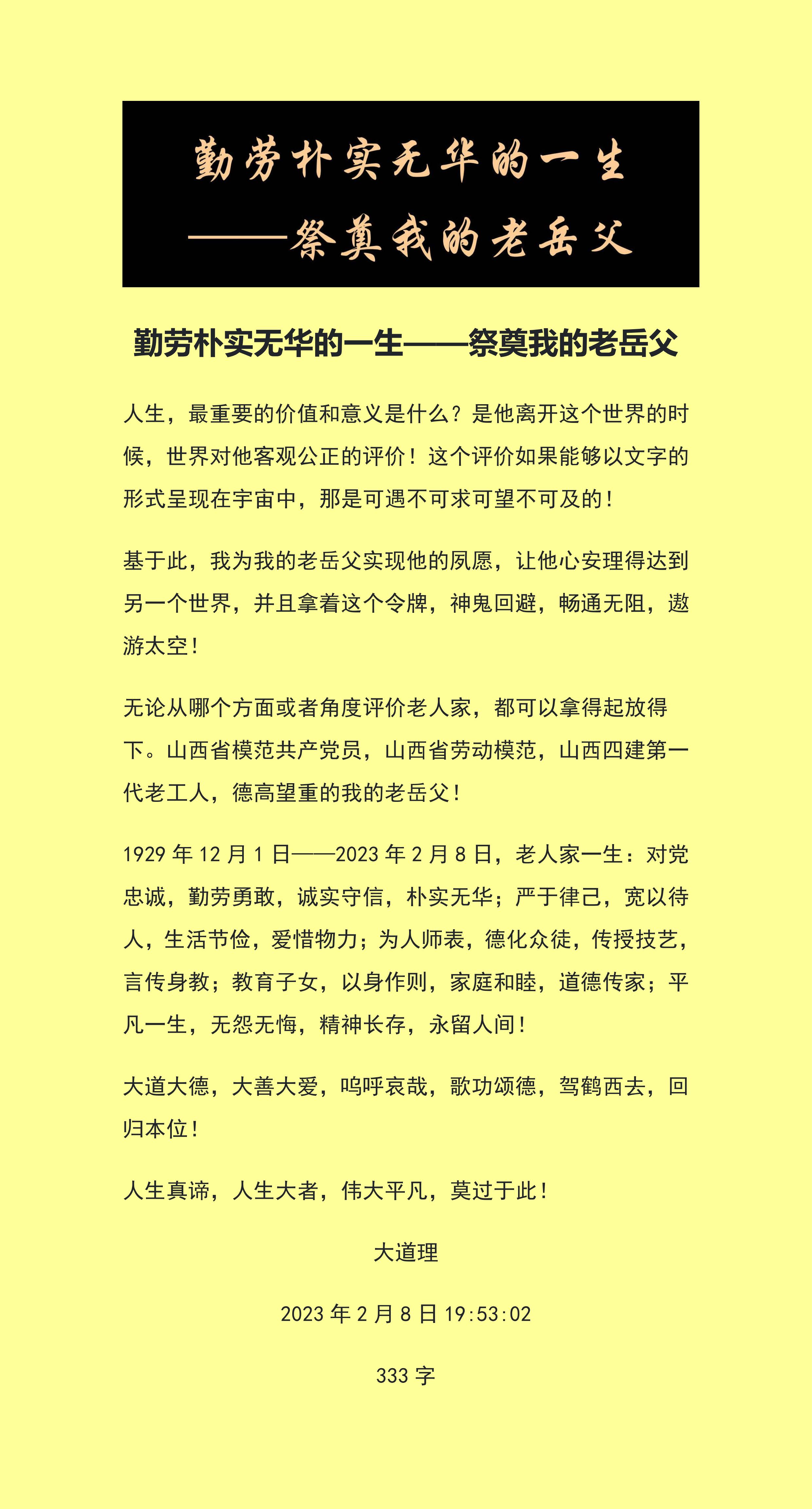 1929年12月1日——2023年2月8日,老人家一生:對黨忠誠,勤勞勇敢,誠實守信,樸實無華;嚴于律己,寬以待人,生活節儉,愛惜物力;為人師表,德化眾徒,傳授技藝,言傳身教;教育子女,以身作則,家庭和睦,道德傳家;平凡一生,無怨無悔,精神長存,永留人間!