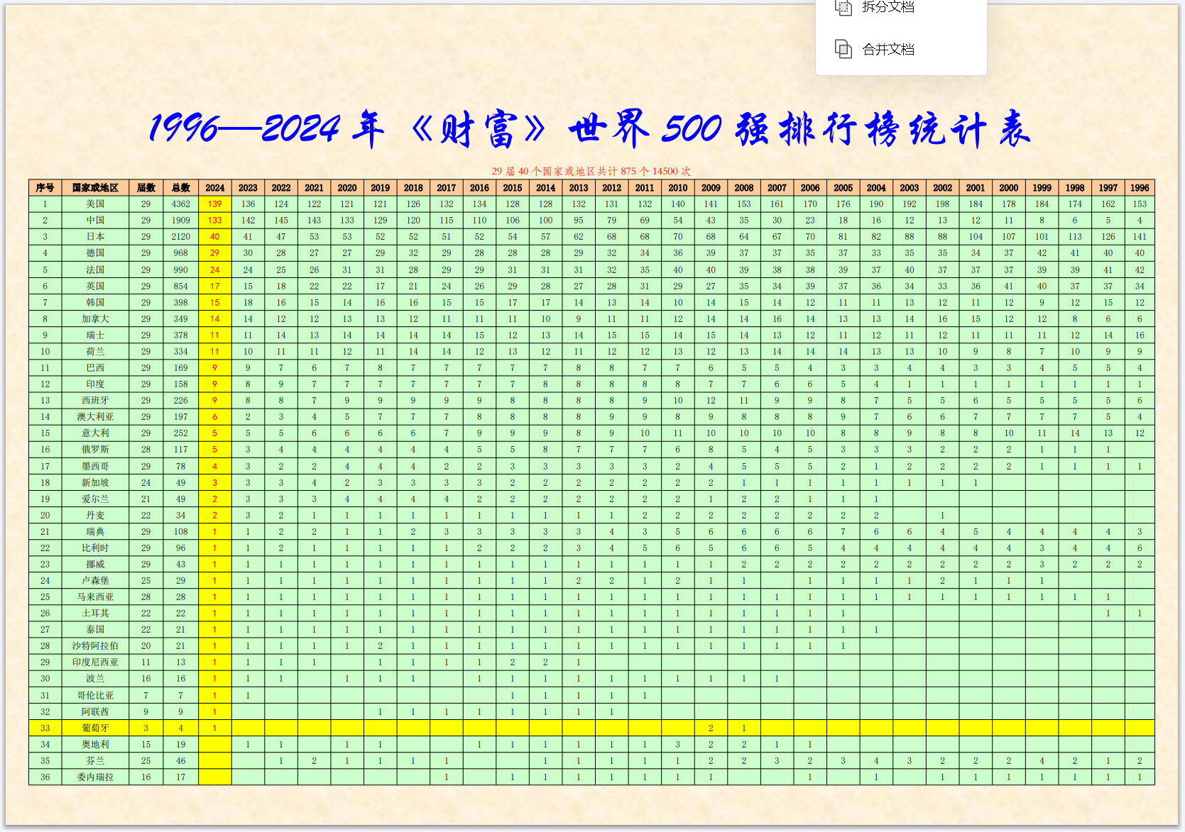 《財富》世界500強雜志社,從1995年開始在中國登陸,已經連續舉辦了29期中文版的世界500強排名榜,我收集到的完整資料,僅缺第一期1995年的全榜單,所以,目前只能編輯二十八期。即1996-2023年《財富》世界500強和中國上榜企業的名單,待日后有機會的話再補齊。