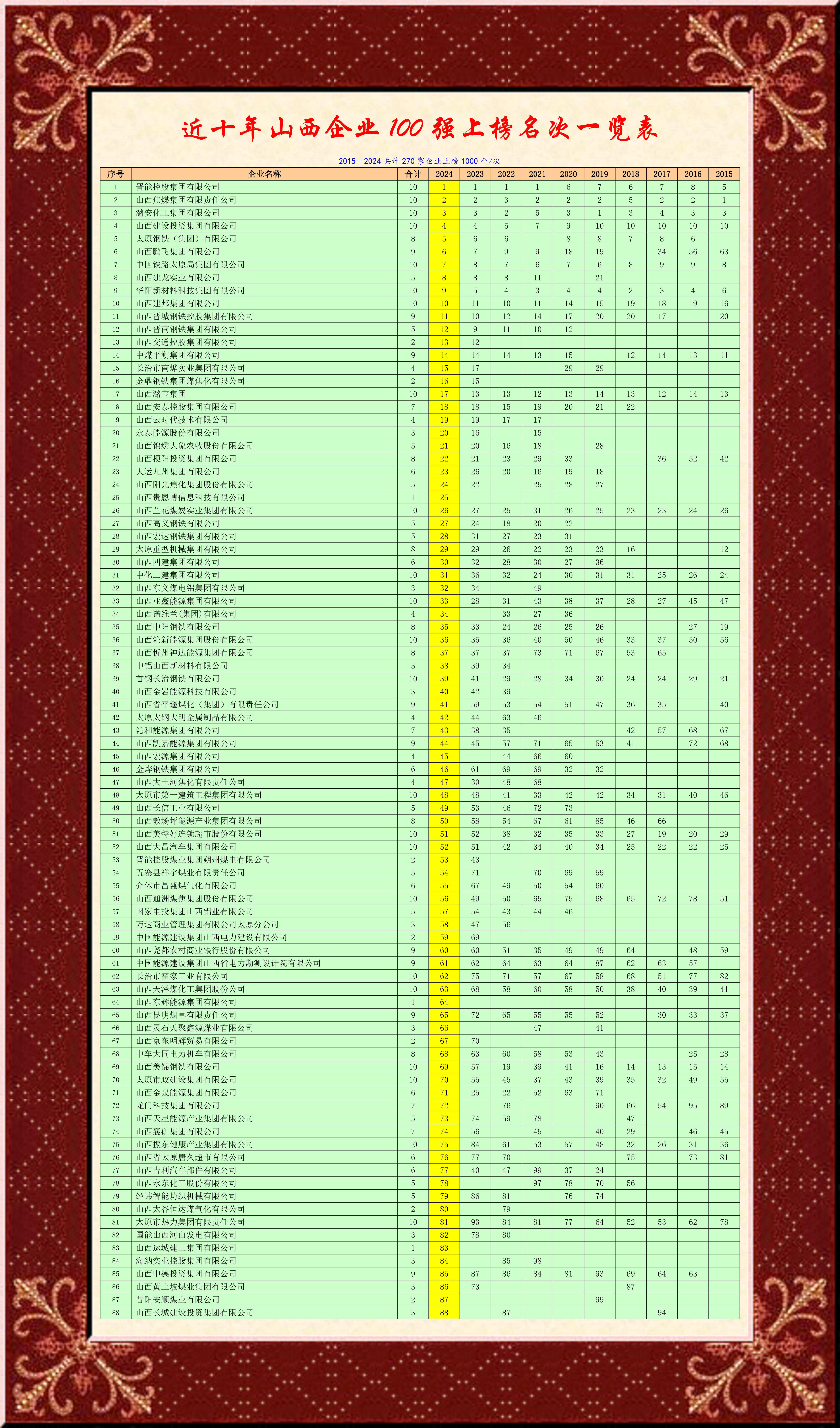今天編輯了2015-2024山西企業(yè)100強上榜名次一覽表,從這個表格中,我們可以看出十年中哪些企業(yè)發(fā)展階段性上升,感悟它們成功跨越和未來發(fā)展的空間。