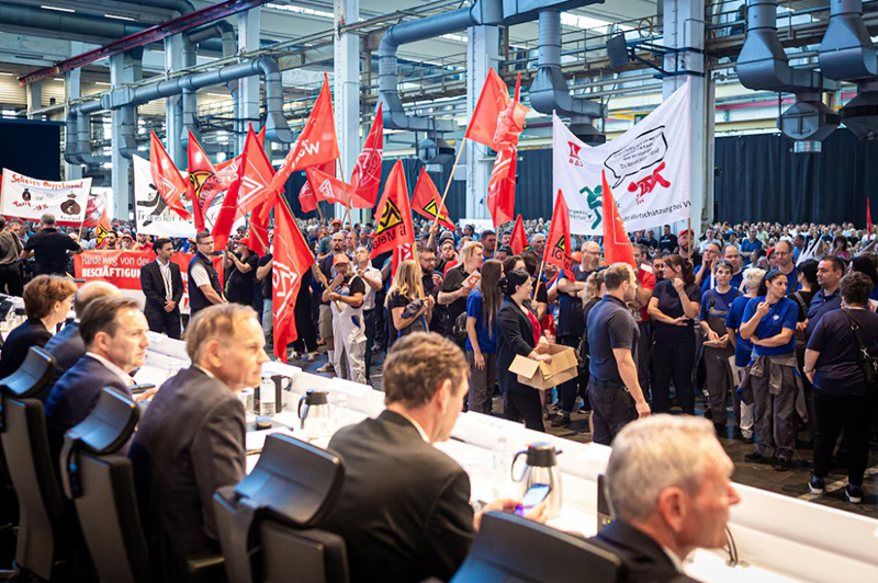 當?shù)貢r間9月4日,首次傳出將關(guān)閉本土工廠消息后,大眾汽車在總部舉行員工大會,工人們手舉標語抗議。 路透社