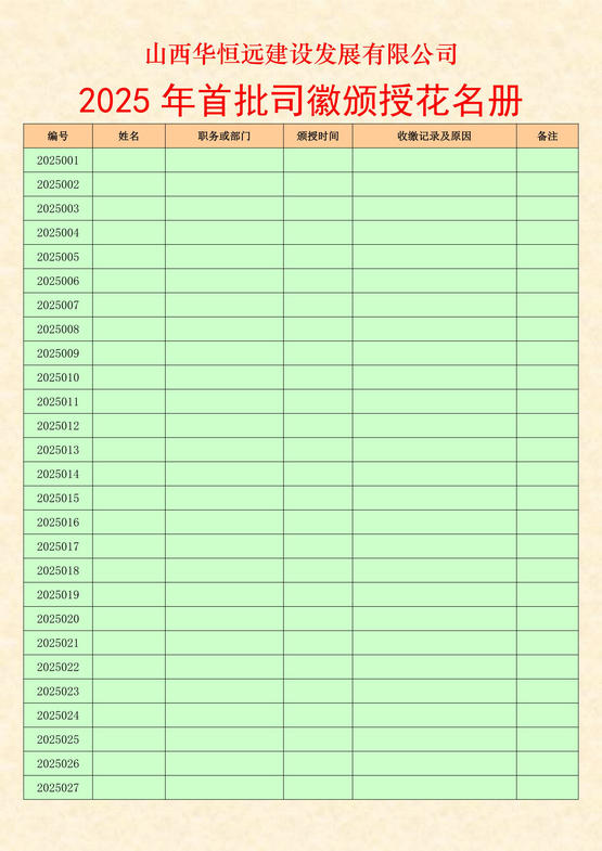 編號(hào)為2025001——2025100,共計(jì)100枚。按公司任命和安排工作職務(wù)登記造冊(cè)依序頒授,離職或辭退員工,必須收繳,以為后續(xù)者循環(huán)佩備之用!