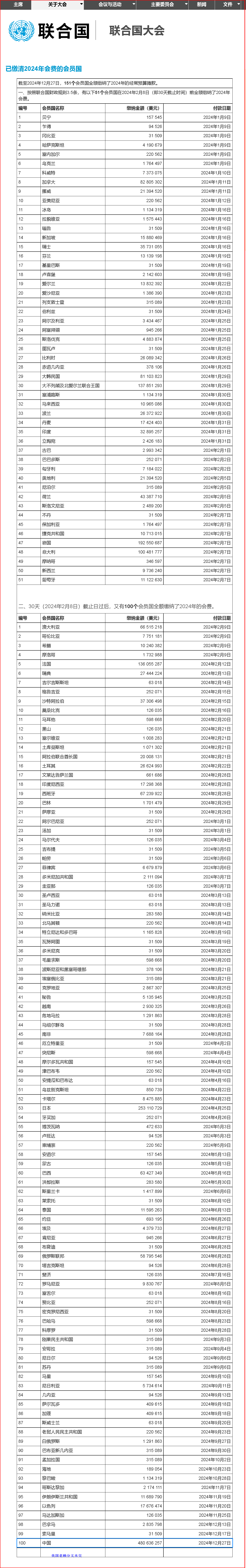 一、按照聯(lián)合國(guó)財(cái)政規(guī)則3.5條,有以下51個(gè)會(huì)員國(guó)在2024年2月8日(即30天截止時(shí)間)前全額繳納了2024年會(huì)費(fèi)。