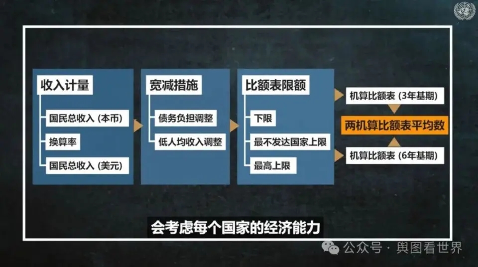 聯(lián)合國(guó)會(huì)費(fèi)分?jǐn)偙壤咳晷抻喴淮危饕凑战?jīng)濟(jì)規(guī)模和人均GNI來分?jǐn)偅罡?2%,最低0.001%。若某個(gè)國(guó)家的人均GNI或人均GDP與全球人均水平相當(dāng)?shù)脑挘涑袚?dān)的聯(lián)合國(guó)會(huì)費(fèi)比例就與其經(jīng)濟(jì)規(guī)模在全球的比例大體一致。發(fā)達(dá)經(jīng)濟(jì)體,其人均GNI或人均GDP是全球人均水平的數(shù)倍,他們承擔(dān)的會(huì)費(fèi)比例也應(yīng)是自身經(jīng)濟(jì)規(guī)模在全球占比的數(shù)倍。低收入國(guó)家,因?yàn)槿司鵊NI偏低,分配到的會(huì)費(fèi)比例由此被拉低。中國(guó)人均GNI和人均GDP基本達(dá)到了全球平均水平,所以我國(guó)承擔(dān)的聯(lián)合國(guó)會(huì)費(fèi)接近“中國(guó)經(jīng)濟(jì)規(guī)模在全球的比例”。而印度,人均GNI只是全球人均水平的五分之一,承擔(dān)的會(huì)費(fèi)比例也要成倍縮減。