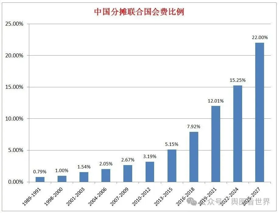 2022-2024年,中國(guó)的分?jǐn)偙葹?5.254%,每年依次繳納4.76億美元、5.18億美元、5.48億美元,合計(jì)繳納15.42億美元。中國(guó)因?yàn)閺?qiáng)勁的經(jīng)濟(jì)表現(xiàn)與影響力,占比由目前的15.254%增加4.75%,達(dá)到20.004%。這也是中國(guó)占比首超20%,直逼美國(guó)的22%。未來三年,即使每年的會(huì)費(fèi)均為37.17億美元,那么中國(guó)合計(jì)需繳納22.30億美元。換言之,2025-2027年中國(guó)至少要多繳納6.88億美元,折合人民幣約50.21億。需要注意的是,聯(lián)合國(guó)的常規(guī)預(yù)算每年都有小幅增長(zhǎng),因此中國(guó)的實(shí)際繳納金額可能會(huì)更高。