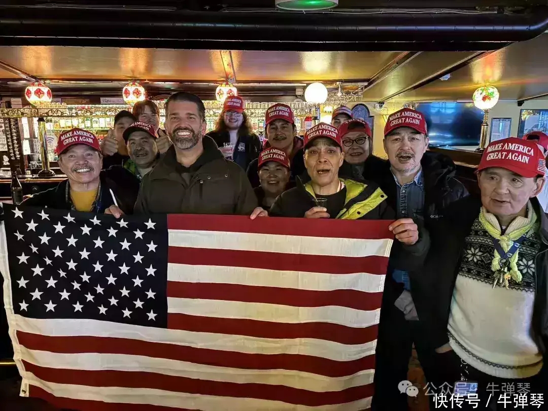 特朗普在發(fā)圖的時(shí)候,他的兒子小特朗普正在格陵蘭島旅行,積極宣傳特朗普的主張,還和當(dāng)?shù)厝斯餐弥绹?guó)國(guó)旗合影。