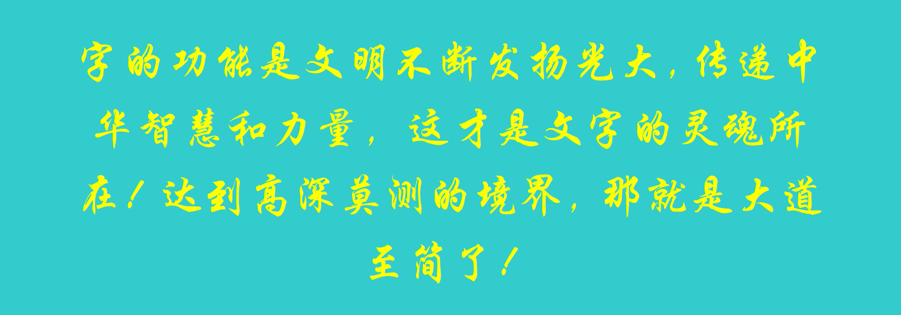 總而言之,字的功能是文明不斷發(fā)揚(yáng)光大,傳遞中華智慧和力量,這才是文字的靈魂所在,達(dá)到高深莫測的境界,那就是大道至簡了!什么是大道?把握規(guī)律!什么是至簡?一錘定音!