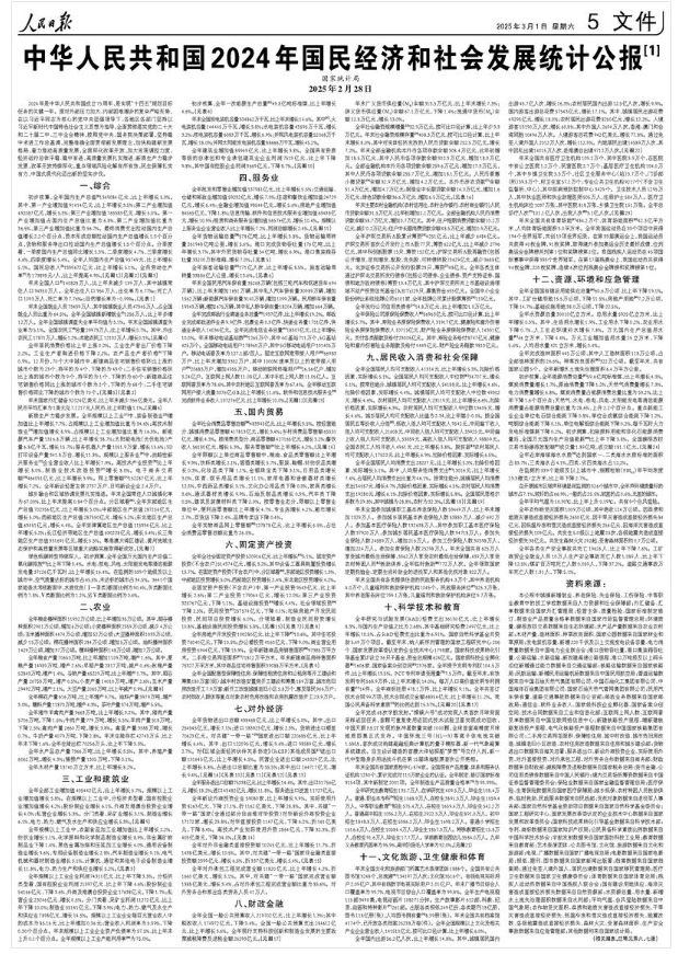 今天,國(guó)家統(tǒng)計(jì)局公布了《中華人民共和國(guó)2024年國(guó)民經(jīng)濟(jì)和社會(huì)發(fā)展統(tǒng)計(jì)公報(bào)》。
