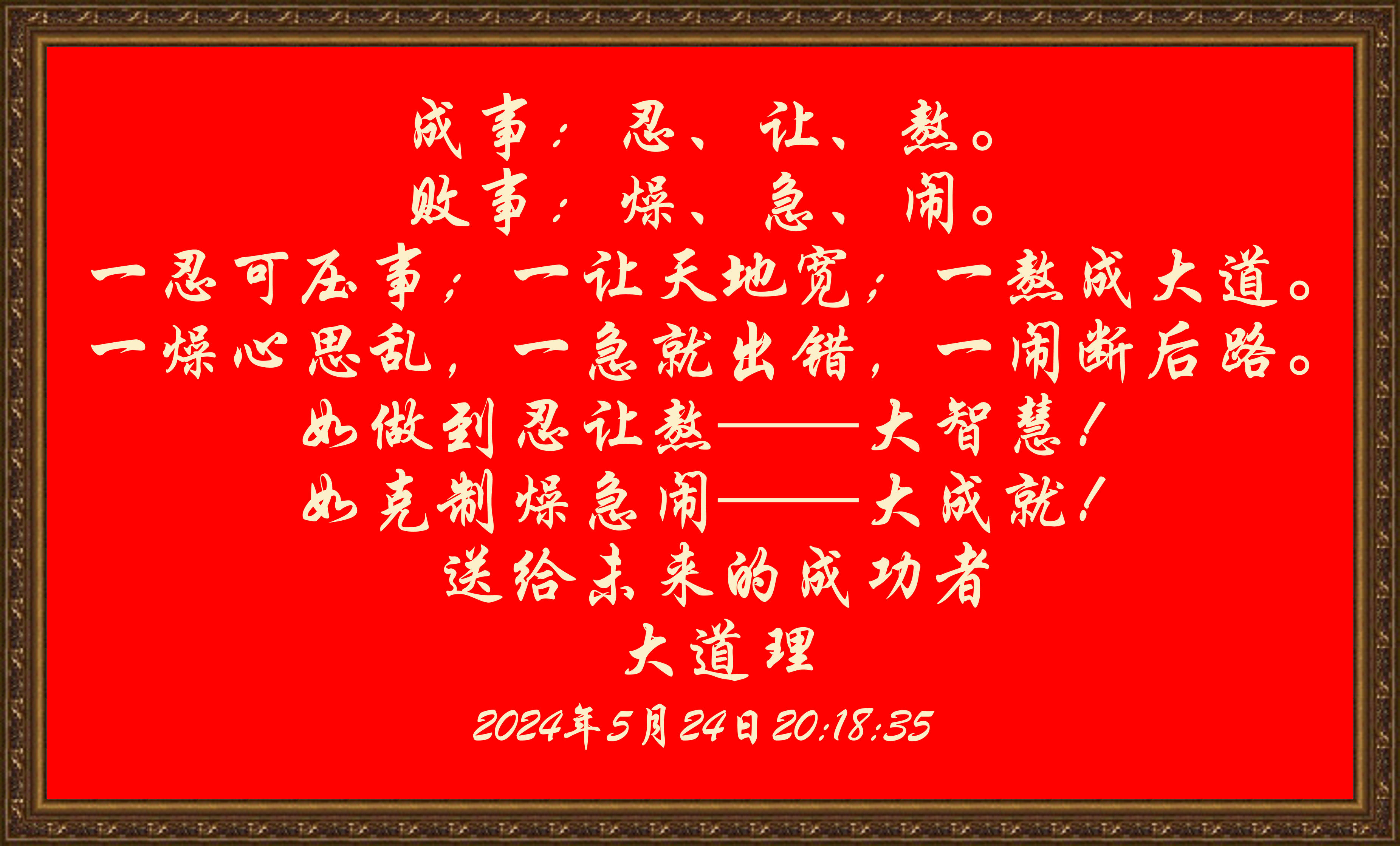 熬是信心,讓是智慧,忍是境界!成就人生事業(yè)的天機就在于忍讓熬三字之中,就在于勤實儉三悟空間之內(nèi)!