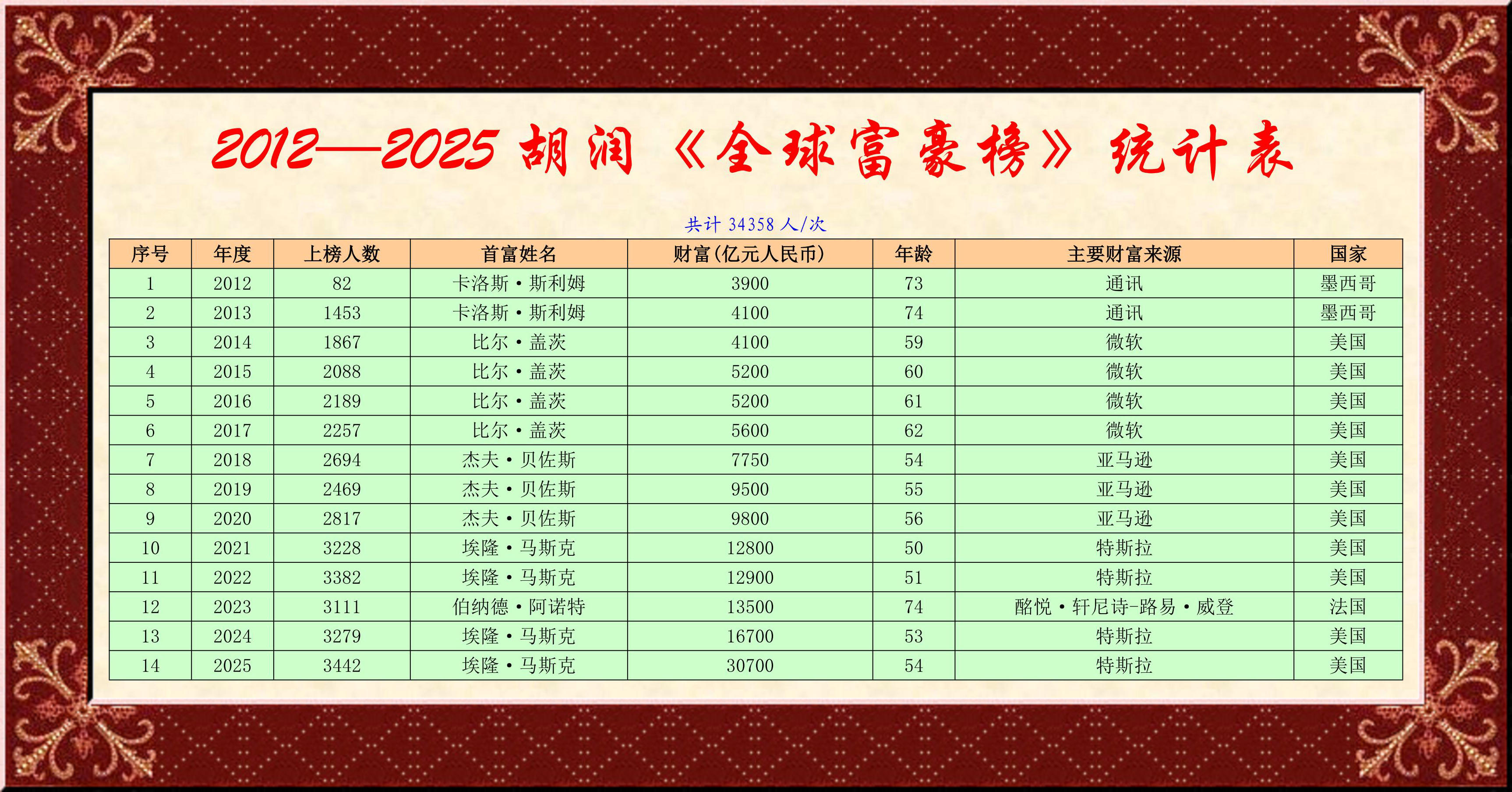今年3442位世界各國企業家上榜《胡潤全球富豪榜》,是十四年來人數最多的一次。