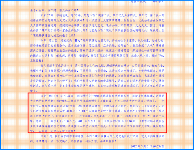 因此,2012年12月23日,太陽照樣會一如既往地升起在世界的東方!這就是根本規(guī)律,這就是大自然的自然現(xiàn)象!到時候杞人憂天的所謂瑪雅預言會不攻自破,并且從此成為歷史笑談。說起來,91年曾經(jīng)有人和我打賭諾查丹馬斯預言1999年地球大爆炸,我的態(tài)度是否定的,事實印證只是泛泛之論。還有巴西大預言家朱瑟里諾說2008年9月13中國海南發(fā)生毀滅性大地震,當時我在下載的這篇文章上批注兩個紅字“胡說!”,時間過去幾年了,并無此事。倒是去年三月十日晚上,和妻子說了一句:“日本這個國家,忽塌一下,海水淹了。”第二天,2011年3月11日,日本當?shù)貢r間14時46分,日本東北部海域發(fā)生里氏9.0級地震并引發(fā)海嘯,造成重大人員傷亡和財產(chǎn)損失。針對前幾年太原市謠傳有大地震,我當時斷言:一百年內(nèi),太原不會有大地震!