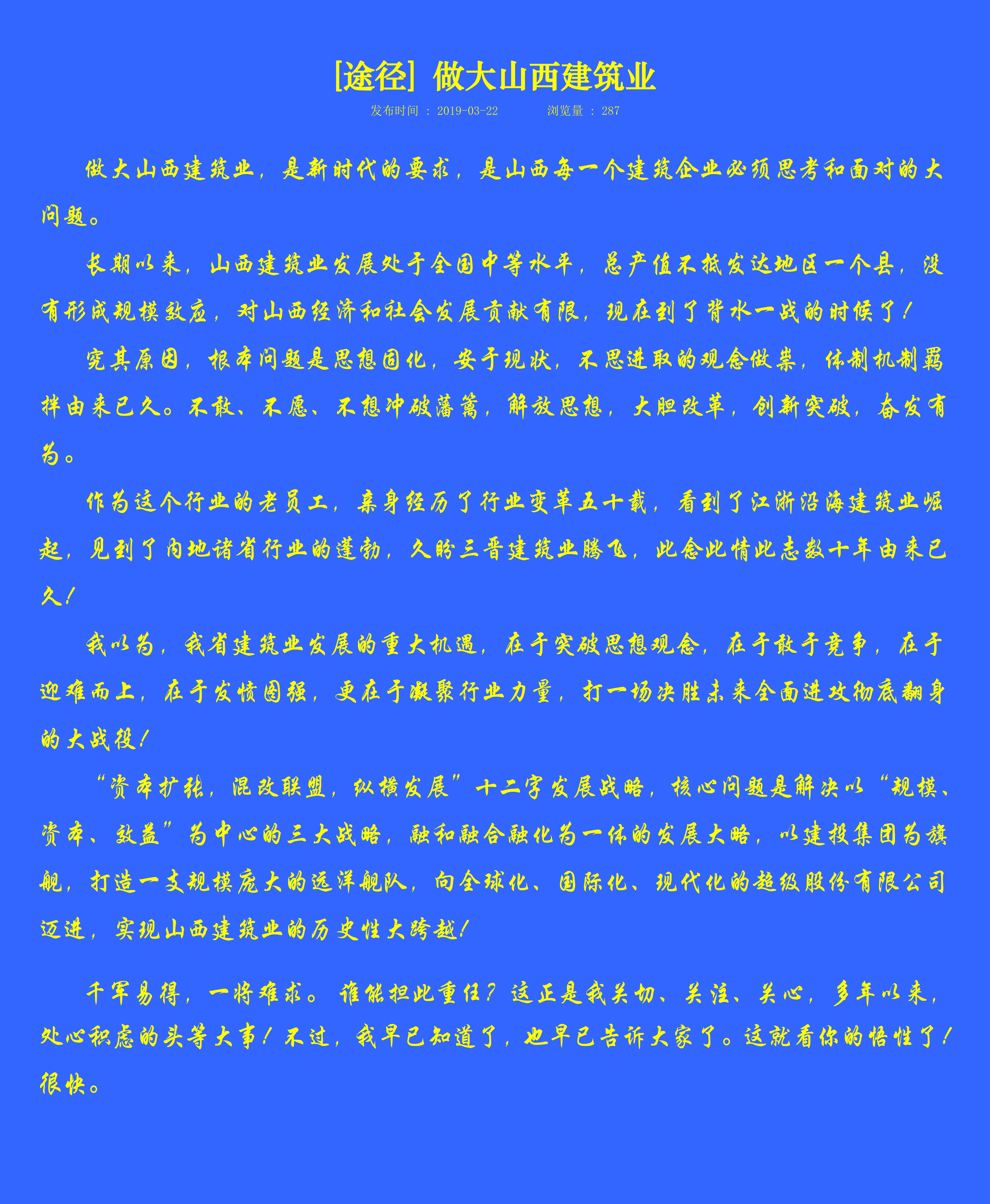 作為這個行業的老員工,親身經歷了行業變革五十載,看到了江浙沿海建筑業崛起,見到了內地諸省行業的蓬勃,久盼三晉建筑業騰飛,此念此情此志數十年由來已久!