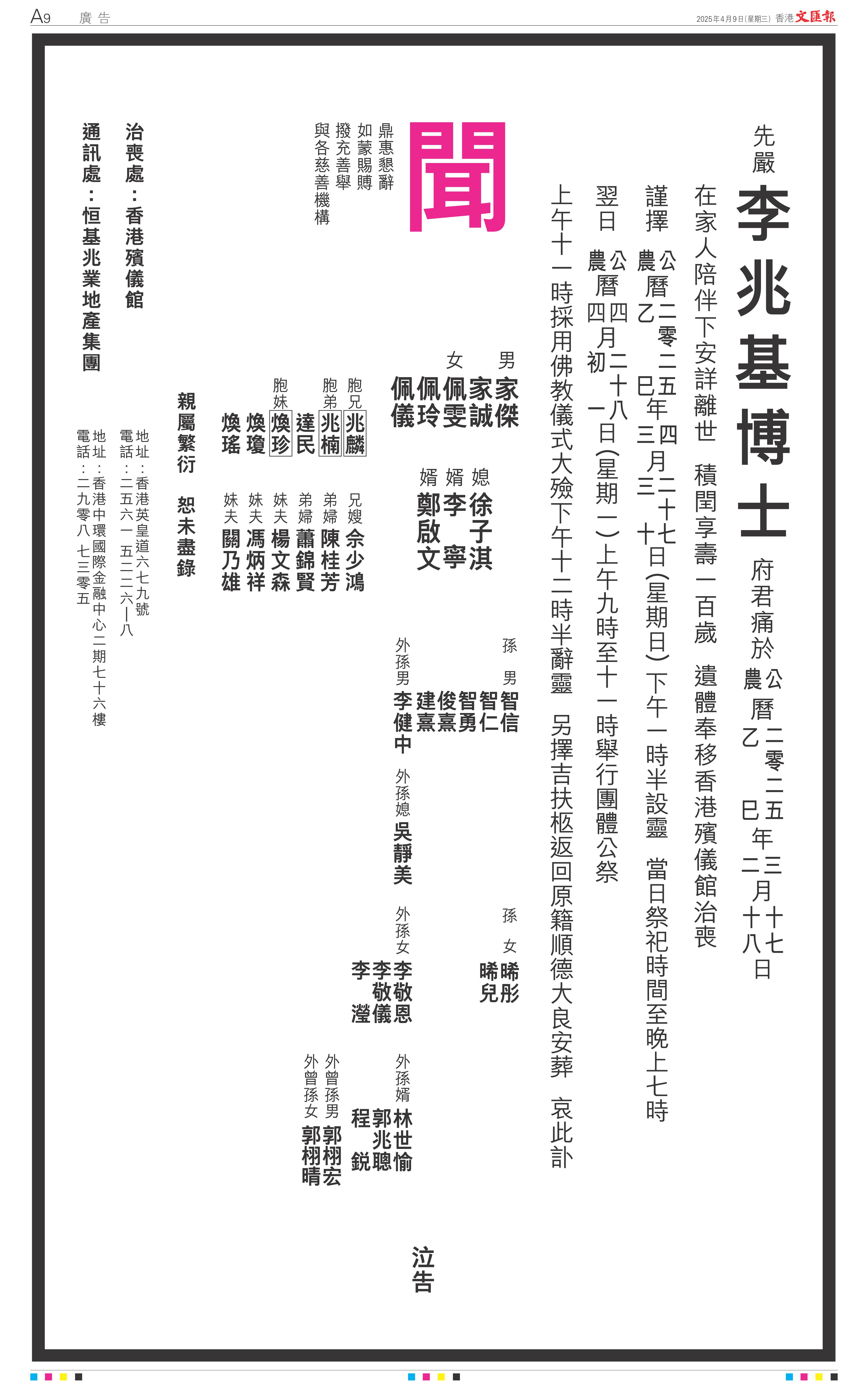 據(jù)香港大公文匯全媒體報(bào)道,恒基地產(chǎn)集團(tuán)創(chuàng)辦人李兆基于3月17日離世,享年97歲,其家屬4月9日正式在報(bào)章刊登訃文。
