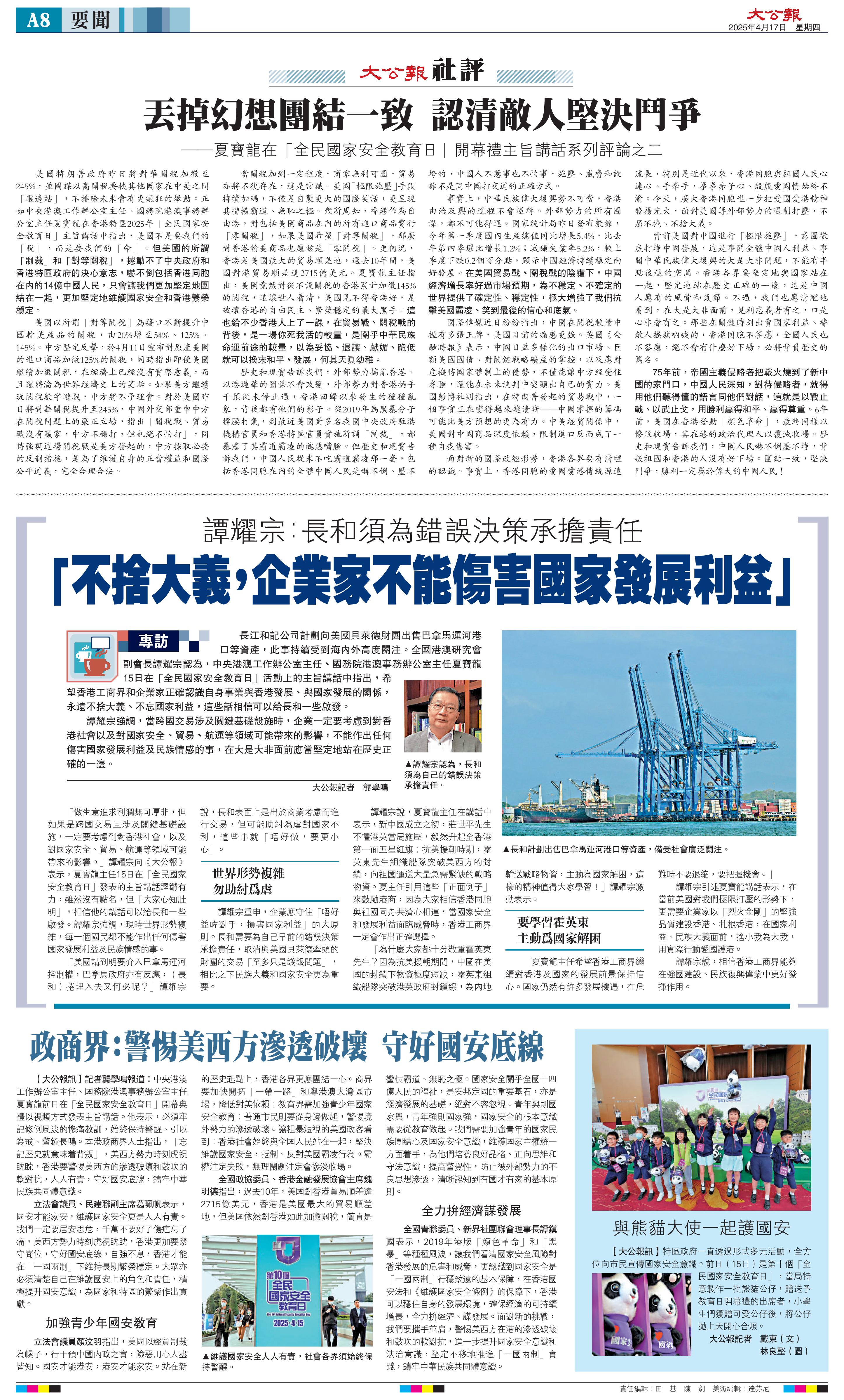 「做生意追求利潤無可厚非,但如果是跨國交易且涉及關鍵基礎設施,一定要考慮到對香港社會,以及對國家安全、貿易、航運等領域可能帶來的影響。」譚耀宗向《大公報》表示,夏寶龍主任15日在「全民國家安全教育日」發表的主旨講話鏗鏘有力,雖然沒有點名,但「大家心知肚明」,相信他的講話可以給長和一些啟發。譚耀宗強調,現時世界形勢復雜,每一個國民都不能作出任何傷害國家發展利益及民族情感的事。
