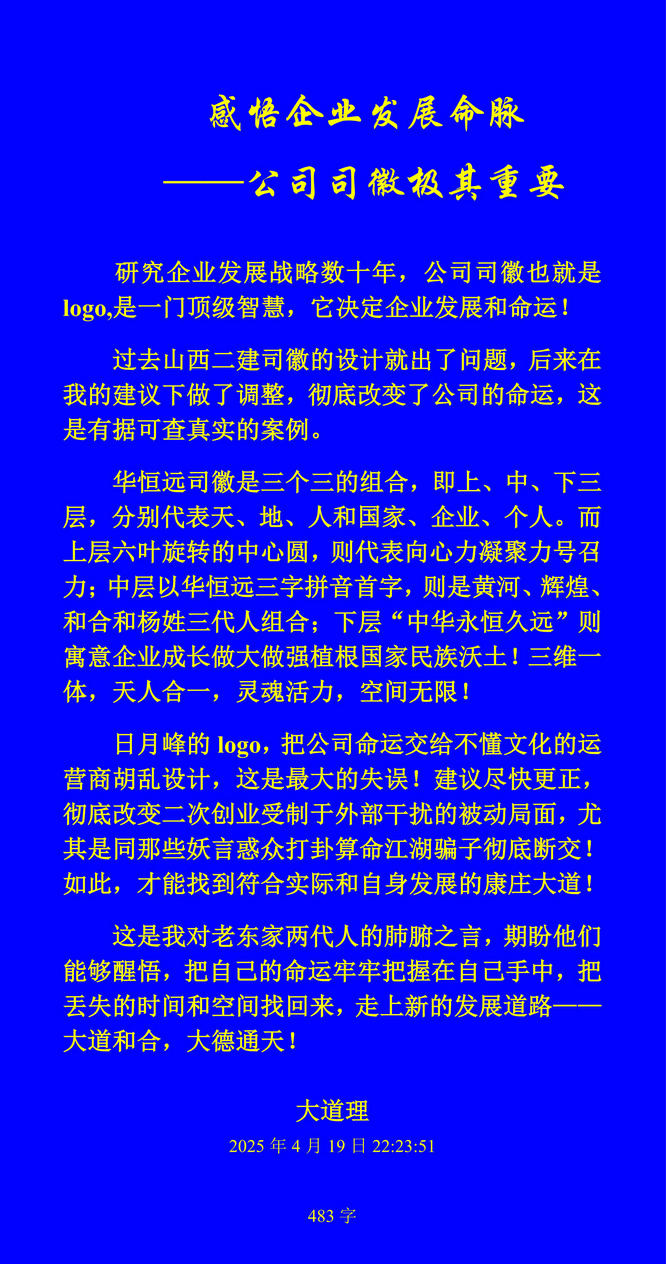這是我對(duì)老東家兩代人的肺腑之言,期盼他們能夠醒悟,把自己的命運(yùn)牢牢把握在自己手中,把丟失的時(shí)間和空間找回來(lái),走上新的發(fā)展道路——大道和合,大德通天!