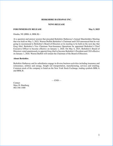 在2025年5月3日伯克希爾·哈撒韋(Berkshire Hathaway)的年度股東大會之前的問答環節上2026年。2025年5月4日,伯克希爾董事會一致投票通過任命格雷格·阿貝爾(Greg Abel),成為伯克希爾總裁兼首席執行官,于2026年1月1日生效。沃倫·巴菲特(Warren Buffett)將繼續擔任董事會主席。