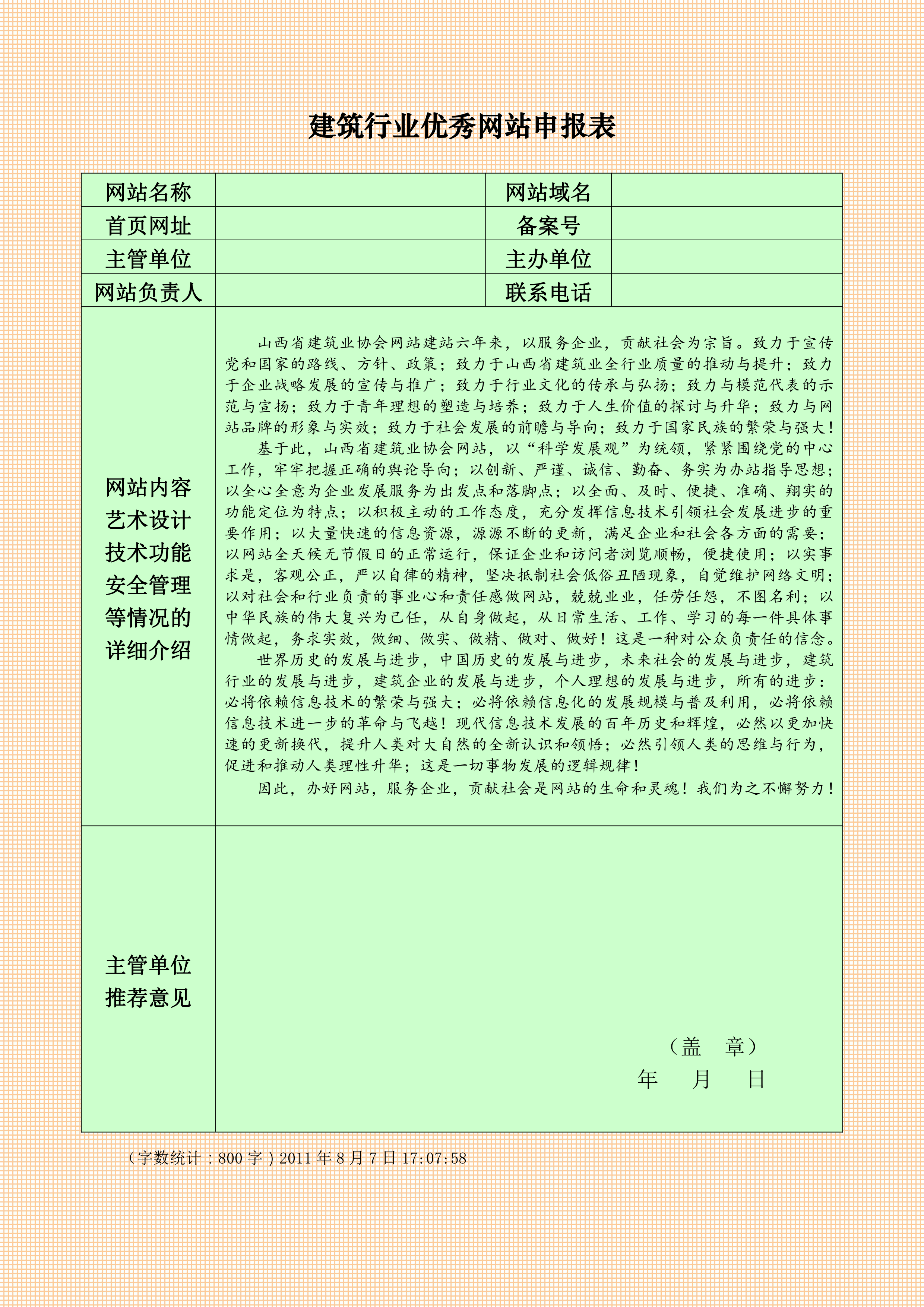 這是2011年在協(xié)會(huì)負(fù)責(zé)網(wǎng)站工作時(shí),我親自撰寫的申報(bào)“全國(guó)建筑行業(yè)精品和優(yōu)秀網(wǎng)站”的文稿,要求內(nèi)容用五號(hào)楷體限制在800字。