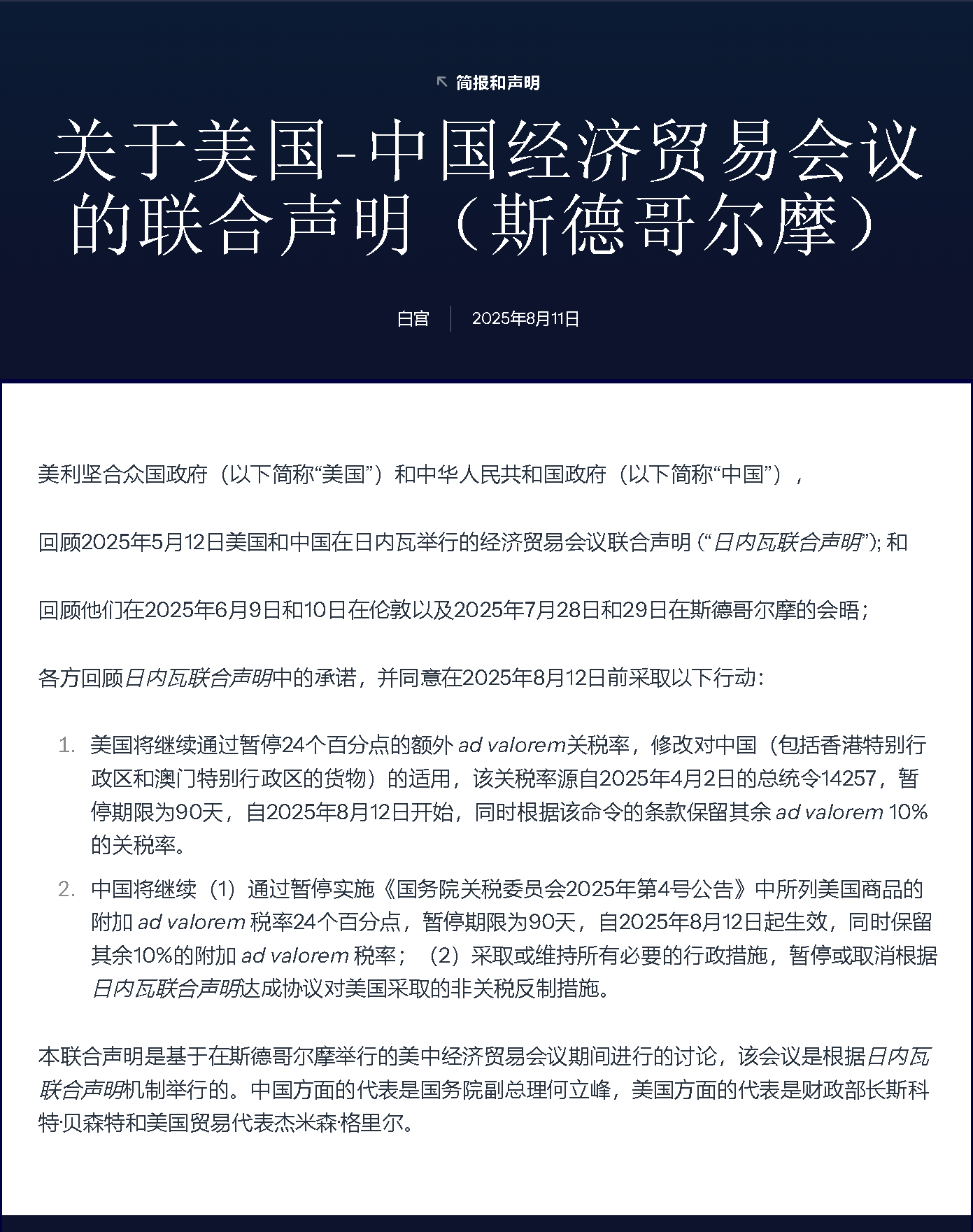 中國將繼續(xù)(1)通過暫停實施《國務(wù)院關(guān)稅委員會2025年第4號公告》中所列美國商品的附加 ad valorem 稅率24個百分點,暫停期限為90天,自2025年8月12日起生效,同時保留其余10%的附加 ad valorem 稅率;(2)采取或維持所有必要的行政措施,暫停或取消根據(jù)日內(nèi)瓦聯(lián)合聲明達(dá)成協(xié)議對美國采取的非關(guān)稅反制措施。