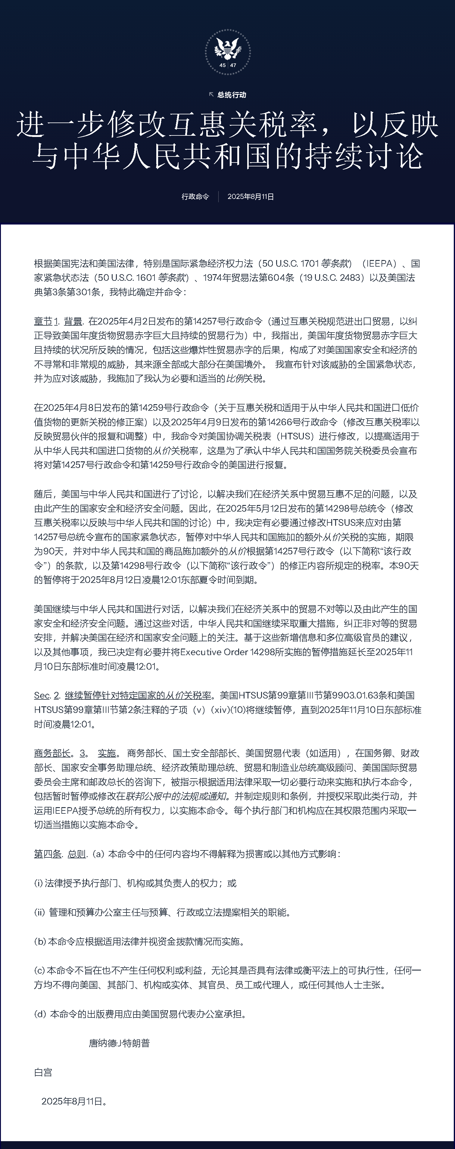 美國繼續(xù)與中華人民共和國進(jìn)行對話,以解決我們在經(jīng)濟(jì)關(guān)系中的貿(mào)易互惠性不足問題,以及由此產(chǎn)生的國家安全和經(jīng)濟(jì)安全問題。通過這些對話,中華人民共和國繼續(xù)采取重大措施,糾正非互惠貿(mào)易安排,并解決美國在經(jīng)濟(jì)和國家安全問題上的關(guān)切。基于這些新增信息和來自多位高級官員的建議,以及其他事項,我已決定有必要并將Executive Order 14298所實施的暫停措施延長至2025年11月10日東部標(biāo)準(zhǔn)時間凌晨12:01。